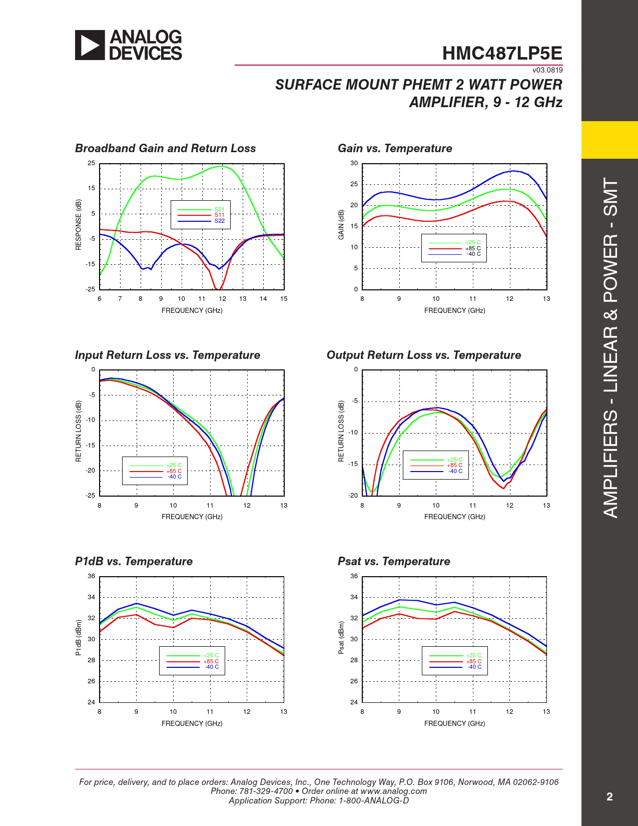HMC487LP5E. SURFACE MOUNT PHEMT 2 WATT POWER. AMPLIFIER, 9 - 12 GHz. Broadband Gain and Return Loss. Gain vs. Temperature