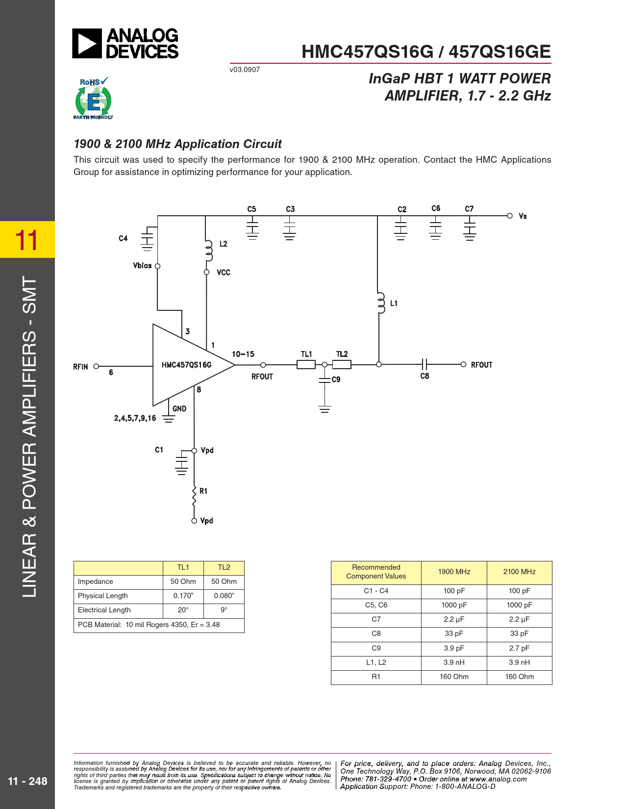 HMC457QS16G / 457QS16GE InGaP HBT 1 WATT POWER AMPLIFIER, 1.7 - 2.2 GHz 1900 & 2100 MHz Application Circuit 11 - 248