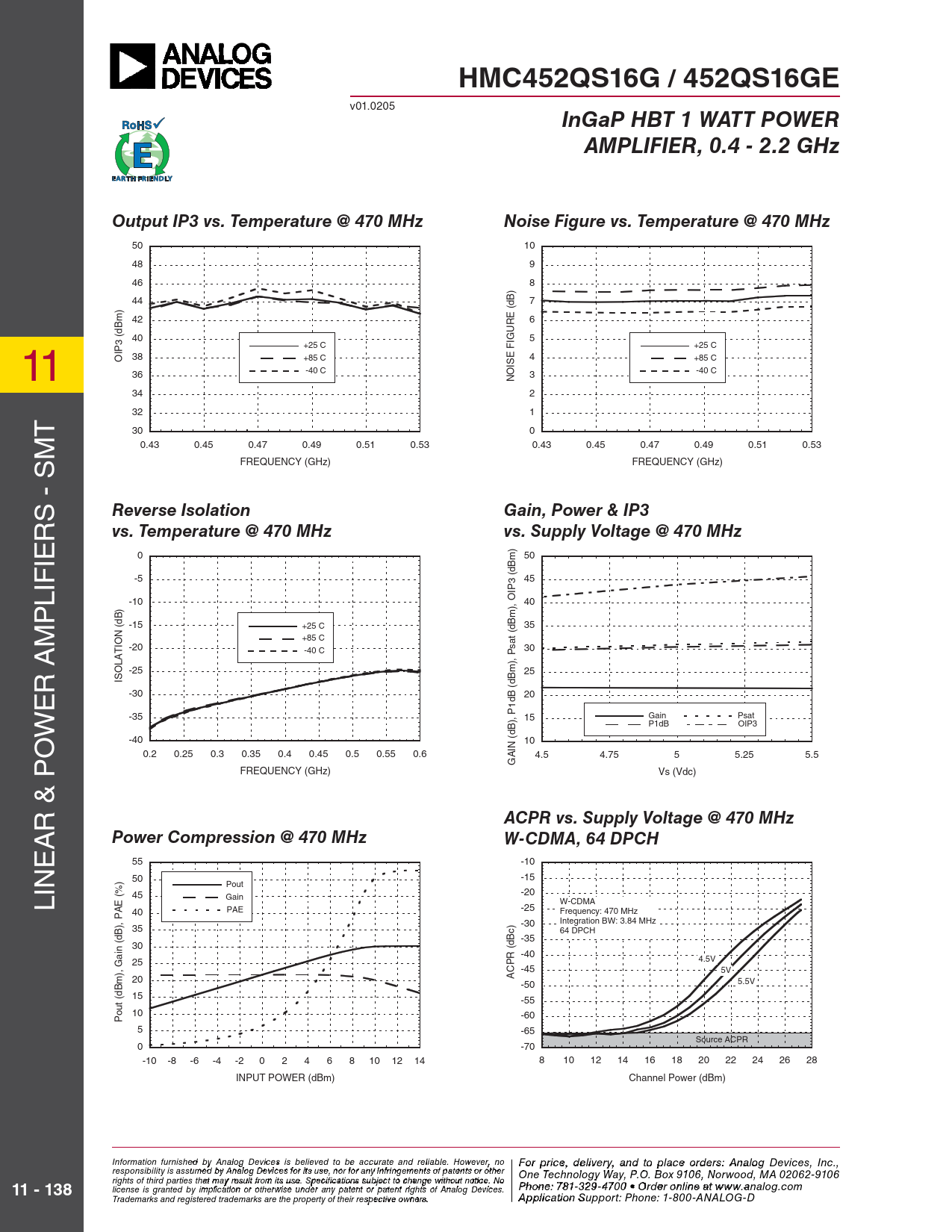 HMC452QS16G / 452QS16GE v01.0205 InGaP HBT 1 WATT POWERAMPLIFIER, 0.4 - 2.2 GHzOutput IP3 vs. Temperature @ 470 MHzNoise Figure vs. Temperature @ 470 MHz 50 10 48 9 46 8 44 7 42 6 40 GURE (dB) 5 11 +25 C +25 C 38 OIP3 (dBm) +85 C 4 +85 C SE FI 36 -40 C 3 -40 C NOI 34 2 T 32 1 30 0 0.43 0.45 0.47 0.49 0.51 0.53 0.43 0.45 0.47 0.49 0.51 0.53 FREQUENCY (GHz) FREQUENCY (GHz) - SM S Reverse IsolationGain, Power & IP3vs. Temperature @ 470 MHzvs. Supply Voltage @ 470 MHz 0 50 -5 45 PLIFIER -10 40 M -15 +25 C 35 +85 C -20 30 -40 C Psat (dBm), OIP3 (dBm) -25 25 ISOLATION (dB) ER A -30 20 W -35 15 Gain Psat P1dB OIP3 O -40 10 0.2 0.25 0.3 0.35 0.4 0.45 0.5 0.55 0.6 4.5 4.75 5 5.25 5.5 GAIN (dB), P1dB (dBm), FREQUENCY (GHz) Vs (Vdc) & P R ACPR vs. Supply Voltage @ 470 MHz A Power Compression @ 470 MHzW-CDMA, 64 DPCH E 55 -10 50 -15 LIN Pout -20 45 Gain W-CDMA PAE -25 40 Frequency: 470 MHz -30 Integration BW: 3.84 MHz 35 64 DPCH -35 30 -40 4.5V 25 -45 5V ACPR (dBc) 20 -50 5.5V 15 -55 10 -60 Pout (dBm), Gain (dB), PAE (%) 5 -65 Source ACPR 0 -70 -10 -8 -6 -4 -2 0 2 4 6 8 10 12 14 8 10 12 14 16 18 20 22 24 26 28 INPUT POWER (dBm) Channel Power (dBm) Information furnish F e o d r pri by An ce, de alog Devic leis vie s rbyeli, a eve nd to pla d to be accur ce o ate an r d der relia s ble , pl . Ho ease co wever, no For price, delivery, and to place orders: Analog Devices, Inc., responsibility is assumed by Analog Devices for its use, nor for any infringements of patents or other ntact Hittite Microwave Corporation: One Technology Way, P.O. Box 9106, Norwood, MA 02062-9106 20 Alpha Road, Chelmsford, MA 01824 Phone rights of third parties that may result from its use. Specifications subject to change without notice. No license is granted by implication or otherwise under any patent or patent rights of Analog Devices. : 978 Phon -e25 : 7 0 81 -3 3 3 29 4 - 3 F 470 ax 0 • O : 978 rder o - nl 25 in 0 e a - t 33 ww 73 11 - 138 w.analog.com Order On- Trademarks and registered trademarks are the property of their respective owners. line at www.hi A tptipte.co licatio m n Support: Phone: 1-800-ANALOG-D