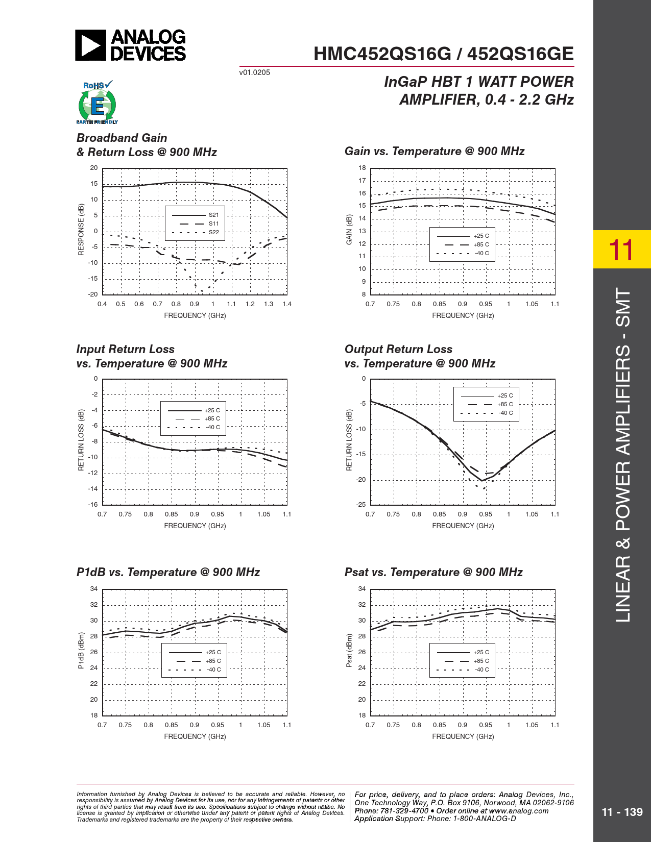 HMC452QS16G / 452QS16GE v01.0205 InGaP HBT 1 WATT POWERAMPLIFIER, 0.4 - 2.2 GHzBroadband Gain & Return Loss @ 900 MHzGain vs. Temperature @ 900 MHz 20 18 17 15 16 10 15 5 S21 14 S11 (dB) 0 S22 13 +25 C GAIN 12 -5 +85 C RESPONSE (dB) 11 -40 C -10 11 10 -15 9 -20 8 T 0.4 0.5 0.6 0.7 0.8 0.9 1 1.1 1.2 1.3 1.4 0.7 0.75 0.8 0.85 0.9 0.95 1 1.05 1.1 FREQUENCY (GHz) FREQUENCY (GHz) - SM Input Return LossOutput Return Loss S vs. Temperature @ 900 MHzvs. Temperature @ 900 MHz 0 0 -2 +25 C -5 +85 C -4 +25 C -40 C +85 C -6 -40 C -10 PLIFIER -8 M -15 -10 RETURN LOSS (dB) RETURN LOSS (dB) -12 -20 -14 ER A -16 -25 W 0.7 0.75 0.8 0.85 0.9 0.95 1 1.05 1.1 0.7 0.75 0.8 0.85 0.9 0.95 1 1.05 1.1 O FREQUENCY (GHz) FREQUENCY (GHz) & P R P1dB vs. Temperature @ 900 MHzPsat vs. Temperature @ 900 MHz A 34 34 E 32 32 30 30 LIN 28 28 26 +25 C 26 +25 C +85 C +85 C Psat (dBm) P1dB (dBm) 24 24 -40 C -40 C 22 22 20 20 18 18 0.7 0.75 0.8 0.85 0.9 0.95 1 1.05 1.1 0.7 0.75 0.8 0.85 0.9 0.95 1 1.05 1.1 FREQUENCY (GHz) FREQUENCY (GHz) Information furnish F e o d r pri by An ce, de alog Devic leis vie s rbyeli, a eve nd to pla d to be accur ce o ate an r d der relia s ble , pl . Ho ease co wever, no For price, delivery, and to place orders: Analog Devices, Inc., responsibility is assumed by Analog Devices for its use, nor for any infringements of patents or other ntact Hittite Microwave Corporation: One Technology Way, P.O. Box 9106, Norwood, MA 02062-9106 20 Alpha Road, Chelmsford, MA 01824 Phone rights of third parties that may result from its use. Specifications subject to change without notice. No license is granted by implication or otherwise under any patent or patent rights of Analog Devices. : 978 Pho - n 25 e: 7 0- 81 33 2 4 9- 3 F 470 ax: 978 0 • Order o - n 25 lin 0 e a-t 3373 www.analog.com 11 - 139 Order On- Trademarks and registered trademarks are the property of their respective owners. line at www.hi A tptipte.co licatio m n Support: Phone: 1-800-ANALOG-D