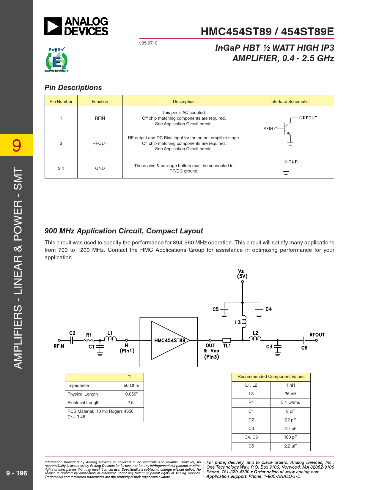 HMC454ST89 / 454ST89E v05.0710 InGaP HBT ½ WATT HIGH IP3AMPLIFIER, 0.4 - 2.5 GHzPin Descriptions Pin Number Function Description Interface Schematic This pin is AC coupled. 1 RFIN Off chip matching components are required. See Application Circuit herein. RF output and DC Bias input for the output amplifi er stage. 9 3 RFOUT Off chip matching components are required. See Application Circuit herein. T These pins & package bottom must be connected to 2,4 GND RF/DC ground. R - SM E W O 900 MHz Application Circuit, Compact Layout This circuit was used to specify the performance for 894-960 MHz operation. This circuit will satisfy many applications from 700 to 1200 MHz. Contact the HMC Applications Group for assistance in optimizing performance for your R & P application. A E IN S - L R IE IF L P M A TL1 Recommended Component Values Impedance 50 Ohm L1, L2 1 nH Physical Length 0.050” L3 36 nH Electrical Length 2.5° R1 5.1 Ohms PCB Material: 10 mil Rogers 4350, C1 8 pF Er = 3.48 C2 22 pF C3 2.7 pF C4, C6 100 pF C5 2.2 μF Info F rmoatr pr ion f iurcne, de ished b ly iv A e n r al y o a g D n evd to p ices is bla eli c eve o ed t rde o be ras: H ccuratite tiatne M d reli iacr ble ow . Ho av wev e C er, n o o rpo Fora r t p iro ic n e ,, 2 d 0 eli A ve lrpha R y, and toad, C o place hoel rd m er s s fo : Ard, MA 01 nalog Devic 8 e 2 s 4 , Inc., responsibility is assumed by Analog Devices for its use, nor for any infringements of patents or other One Technology Way, P.O. Box 9106, Norwood, MA 02062-9106 Phone: 978-250-3343 Fax: 978-250-3373 O rights of third parties that may result from its use. Specifications subject to change without notice. No P rde hone r O : 7 n 81- -3li 2n 9 e a -47 t w 0 w 0 • O w rd .ehit r o t nilte in .c e ao t m 9 - 196 license is granted by implication or otherwise under any patent or patent rights of Analog Devices. www.analog.com Application Support: Pho Trademarks and registered trademarks are the property of their respective owners. ne: 978-250-33 A 4 p 3 o plica r app tion Su s p @ po h rt itt : P ite ho .c ne o : 1m -800-ANALOG-D