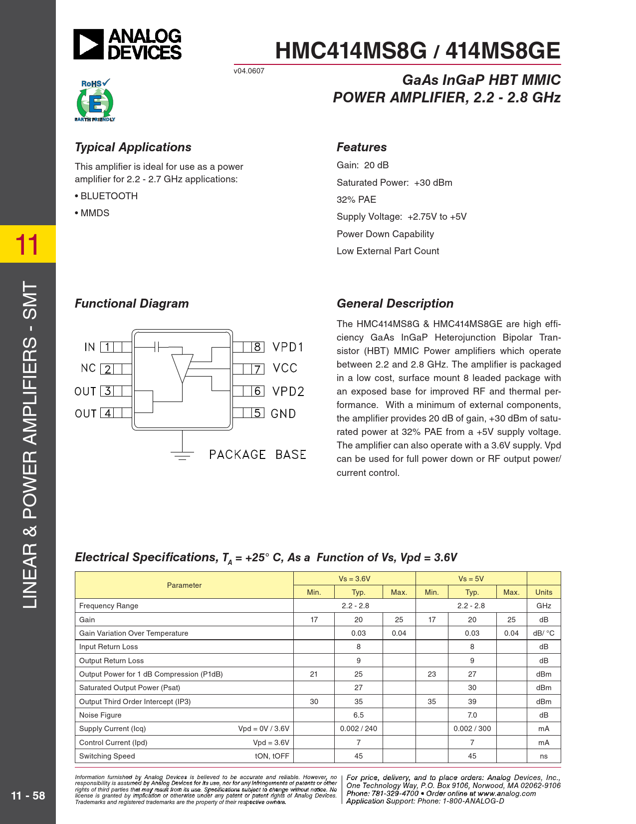 - SM The HMC414MS8G & HMC414MS8GE are high effi- S ciency GaAs InGaP Heterojunction Bipolar Tran- R sistor (HBT) MMIC Power amplifi ers which operate between 2.2 and 2.8 GHz. The amplifi er is packaged IE in a low cost, surface mount 8 leaded package with IF L an exposed base for improved RF and thermal per- P formance. With a minimum of external components, the amplifi er provides 20 dB of gain, +30 dBm of satu- M rated power at 32% PAE from a +5V supply voltage. The amplifi er can also operate with a 3.6V supply. Vpd R A can be used for full power down or RF output power/ E current control. W O & P R A