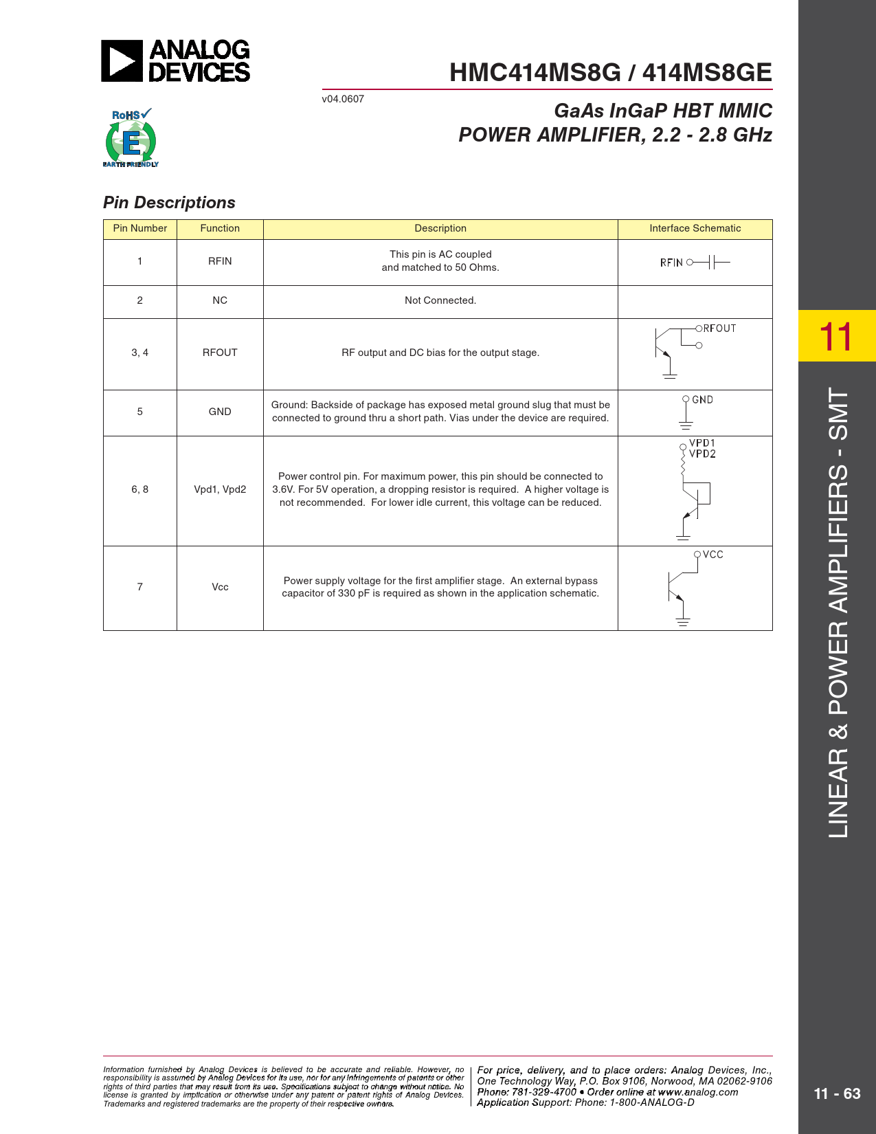 HMC414MS8G / 414MS8GE. GaAs InGaP HBT MMIC. POWER AMPLIFIER, 2.2 - 2.8 GHz. Pin Descriptions. 11 - 63