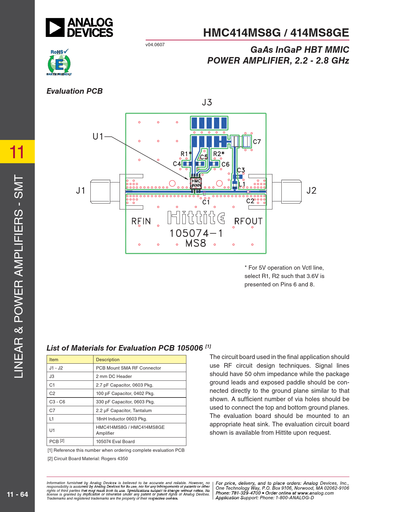 HMC414MS8G / 414MS8GE. GaAs InGaP HBT MMIC. POWER AMPLIFIER, 2.2 - 2.8 GHz. Evaluation PCB