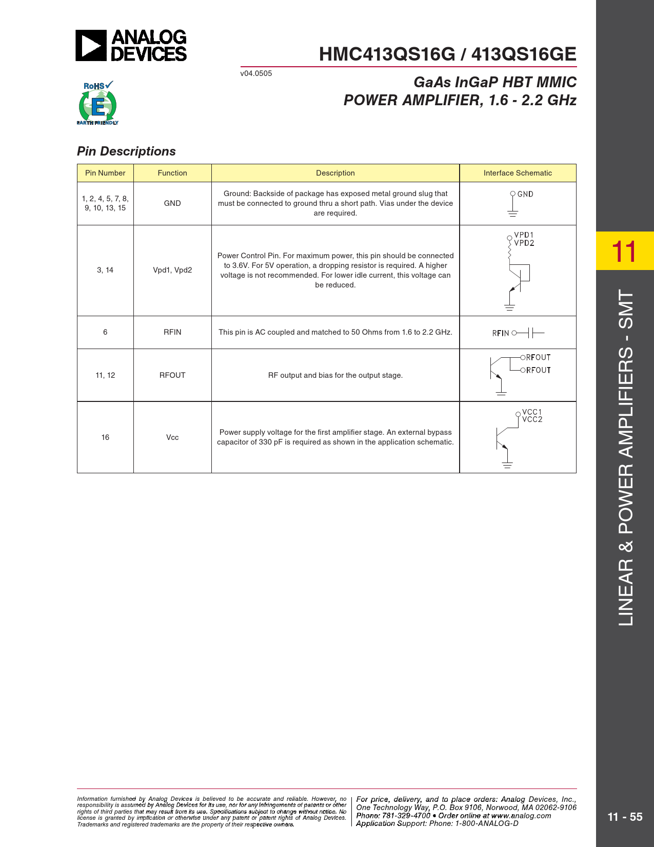 HMC413QS16G / 413QS16GE. GaAs InGaP HBT MMIC. POWER AMPLIFIER, 1.6 - 2.2 GHz. Pin Descriptions. 11 - 55