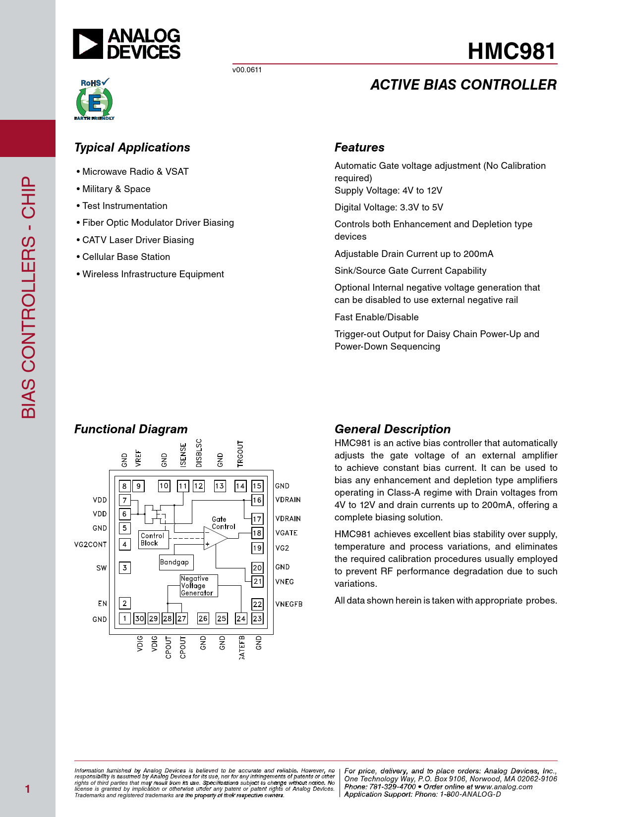HMC981. ACTIVE BIAS CONTROLLER. Typical Applications. Features. Functional Diagram. General Description