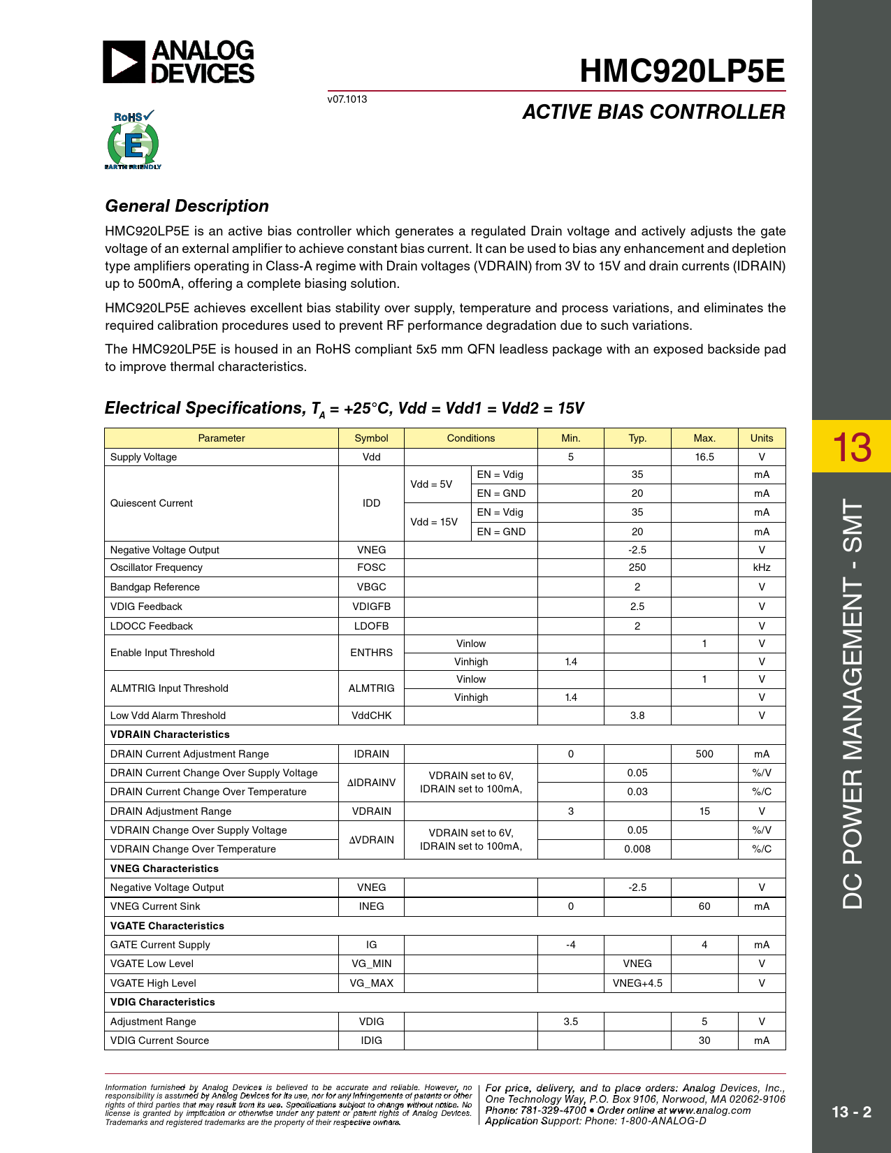HMC920LP5E ACTIVE BIAS CONTROLLER General Description Electrical Specifications, T = +25°C, Vdd = Vdd1 = Vdd2 = 15V