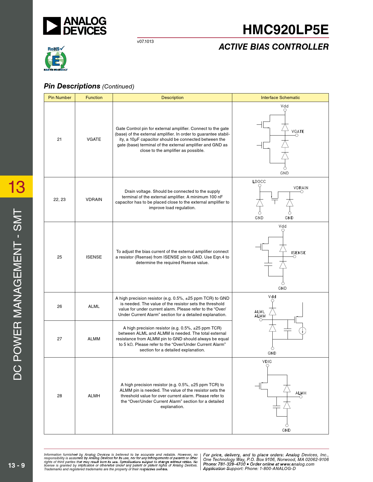HMC920LP5E v07.1013 ACTIVE BIAS CONTROLLERPin Descriptions (Continued) Pin Number Function Description Interface Schematic Gate Control pin for external amplifier. Connect to the gate (base) of the external amplifier. In order to guarantee stabil- 21 VGATE ity, a 10µF capacitor should be connected between the gate (base) terminal of the external amplifier and GND as close to the amplifier as possible. 13 Drain voltage. Should be connected to the supply terminal of the external amplifier. A minimum 100 nF 22, 23 VDRAIN capacitor has to be placed close to the external amplifier to T improve load regulation. M T - S N To adjust the bias current of the external amplifier connect E 25 ISENSE a resistor (Rsense) from ISENSE pin to GND. Use Eqn.4 to M determine the required Rsense value. E G A N A high precision resistor (e.g. 0.5%, ±25 ppm TCR) to GND A is needed. The value of the resistor sets the threshold 26 ALML value for under current alarm. Please refer to the “Over/ Under Current Alarm” section for a detailed explanation. R M E A high precision resistor (e.g. 0.5%, ±25 ppm TCR) between ALML and ALMM is needed. The total external W 27 ALMM resistance from ALMM pin to GND should always be equal to 5 kΩ. Please refer to the “Over/Under Current Alarm” O section for a detailed explanation. C P D A high precision resistor (e.g. 0.5%, ±25 ppm TCR) to ALMM pin is needed. The value of the resistor sets the 28 ALMH threshold value for over current alarm. Please refer to the “Over/Under Current Alarm” section for a detailed explanation. Information furnish F e o d r p by A rnic alo e g , d Devi ecleis vie s rby eli, a eve nd t d to b o p e a l cc a ur c at e o e an r d d releiars ble , p . Ho le we a ve sr, e c no For price, delivery, and to place orders: Analog Devices, Inc., responsibility is assumed by Analog Devices for its use, nor for any infringements of patents or other ontact Hittite Microwave Corporation: One Technology Way, P.O. Box 9106, Norwood, MA 02062-9106 20 Alpha Road, Chelmsford, MA 01824 Phone rights of third parties that may result from its use. Specifications subject to change without notice. No : 9P7 h 8 o - n 2 e 5 : 7 0- 81- 3 3 3 2 4 9- 3 F 470 ax: 9 0 • Ord 7 e 8 r o - n 2 li 5 n 0 e a-t 337 ww 3 13 - 9 license is granted by implication or otherwise under any patent or patent rights of Analog Devices. w.analog.com Order On- Trademarks and registered trademarks are the property of their respective owners. line at www.hi A tptiptliec.actio o m n Support: Phone: 1-800-ANALOG-D