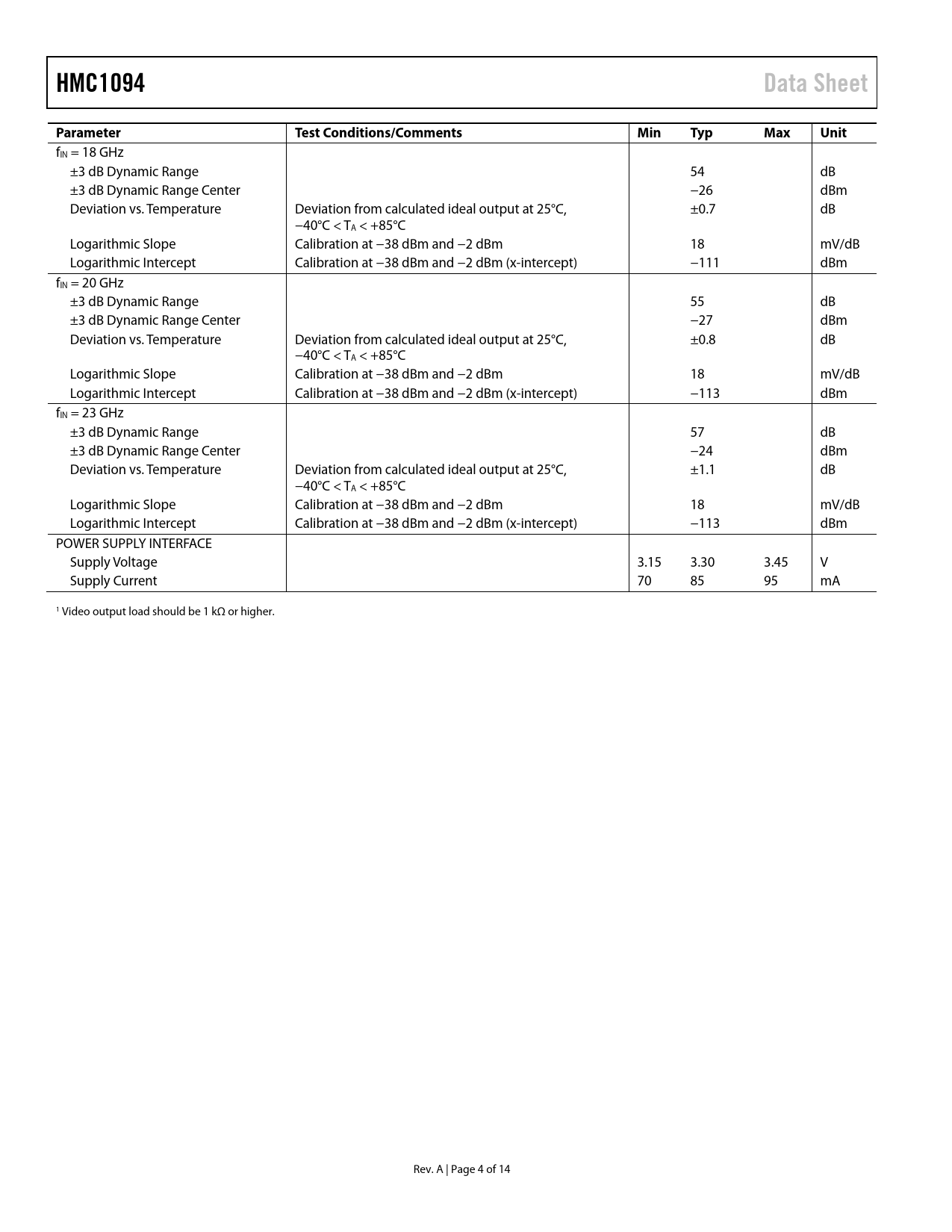 HMC1094Data SheetParameterTest Conditions/CommentsMinTypMaxUnit fIN = 18 GHz ±3 dB Dynamic Range 54 dB ±3 dB Dynamic Range Center −26 dBm Deviation vs. Temperature Deviation from calculated ideal output at 25°C, ±0.7 dB −40°C < TA < +85°C Logarithmic Slope Calibration at −38 dBm and −2 dBm 18 mV/dB Logarithmic Intercept Calibration at −38 dBm and −2 dBm (x-intercept) −111 dBm fIN = 20 GHz ±3 dB Dynamic Range 55 dB ±3 dB Dynamic Range Center −27 dBm Deviation vs. Temperature Deviation from calculated ideal output at 25°C, ±0.8 dB −40°C < TA < +85°C Logarithmic Slope Calibration at −38 dBm and −2 dBm 18 mV/dB Logarithmic Intercept Calibration at −38 dBm and −2 dBm (x-intercept) −113 dBm fIN = 23 GHz ±3 dB Dynamic Range 57 dB ±3 dB Dynamic Range Center −24 dBm Deviation vs. Temperature Deviation from calculated ideal output at 25°C, ±1.1 dB −40°C < TA < +85°C Logarithmic Slope Calibration at −38 dBm and −2 dBm 18 mV/dB Logarithmic Intercept Calibration at −38 dBm and −2 dBm (x-intercept) −113 dBm POWER SUPPLY INTERFACE Supply Voltage 3.15 3.30 3.45 V Supply Current 70 85 95 mA 1 Video output load should be 1 kΩ or higher. Rev. A | Page 4 of 14 Document Outline FEATURES APPLICATIONS FUNCTIONAL BLOCK DIAGRAM GENERAL DESCRIPTION TABLE OF CONTENTS REVISION HISTORY SPECIFICATIONS ABSOLUTE MAXIMUM RATINGS ESD CAUTION PIN CONFIGURATION AND FUNCTION DESCRIPTIONS INTERFACE SCHEMATICS TYPICAL PERFORMANCE CHARACTERISTICS APPLICATION AND EVALUATION PRINTED CIRCUIT BOARD (PCB) SCHEMATIC EVALUATION PCB BILL OF MATERIALS FOR EVALUATION PCB PACKAGING AND ORDERING INFORMATION OUTLINE DIMENSIONS ORDERING GUIDE