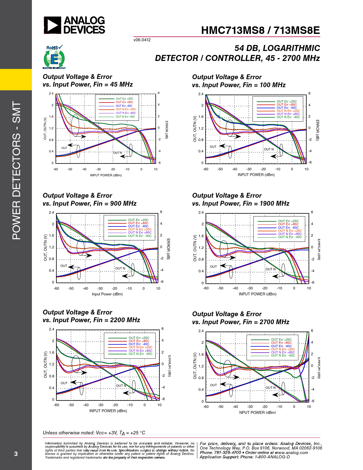 HMC713MS8 / 713MS8E. 54 DB, LOGARITHMIC. DETECTOR / CONTROLLER, 45 - 2700 MHz. Output Voltage & Error