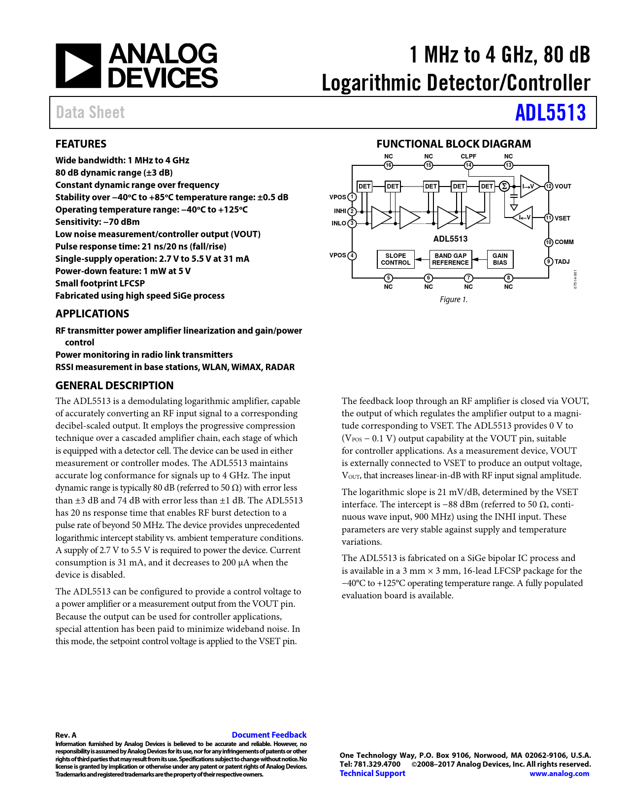 1 MHz to 4 GHz, 80 dB. Logarithmic Detector/Control er. Data Sheet. ADL5513. FEATURES. FUNCTIONAL BLOCK DIAGRAM