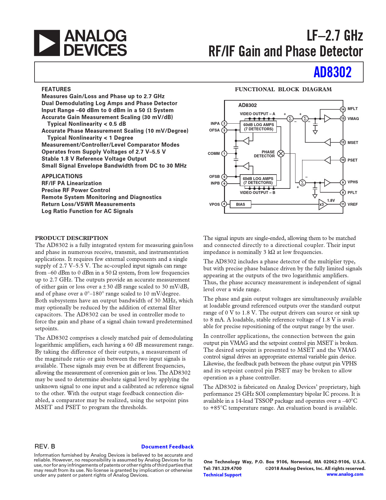 LF–2.7 GHz RF/IF Gain and Phase Detector AD8302 FEATURES FUNCTIONAL BLOCK DIAGRAM Measures Gain/Loss and Phase up to 2.7 GHz Dual Demodulating Log Amps and Phase Detector AD8302 MFLT Input Range –60 dBm to 0 dBm in a 50