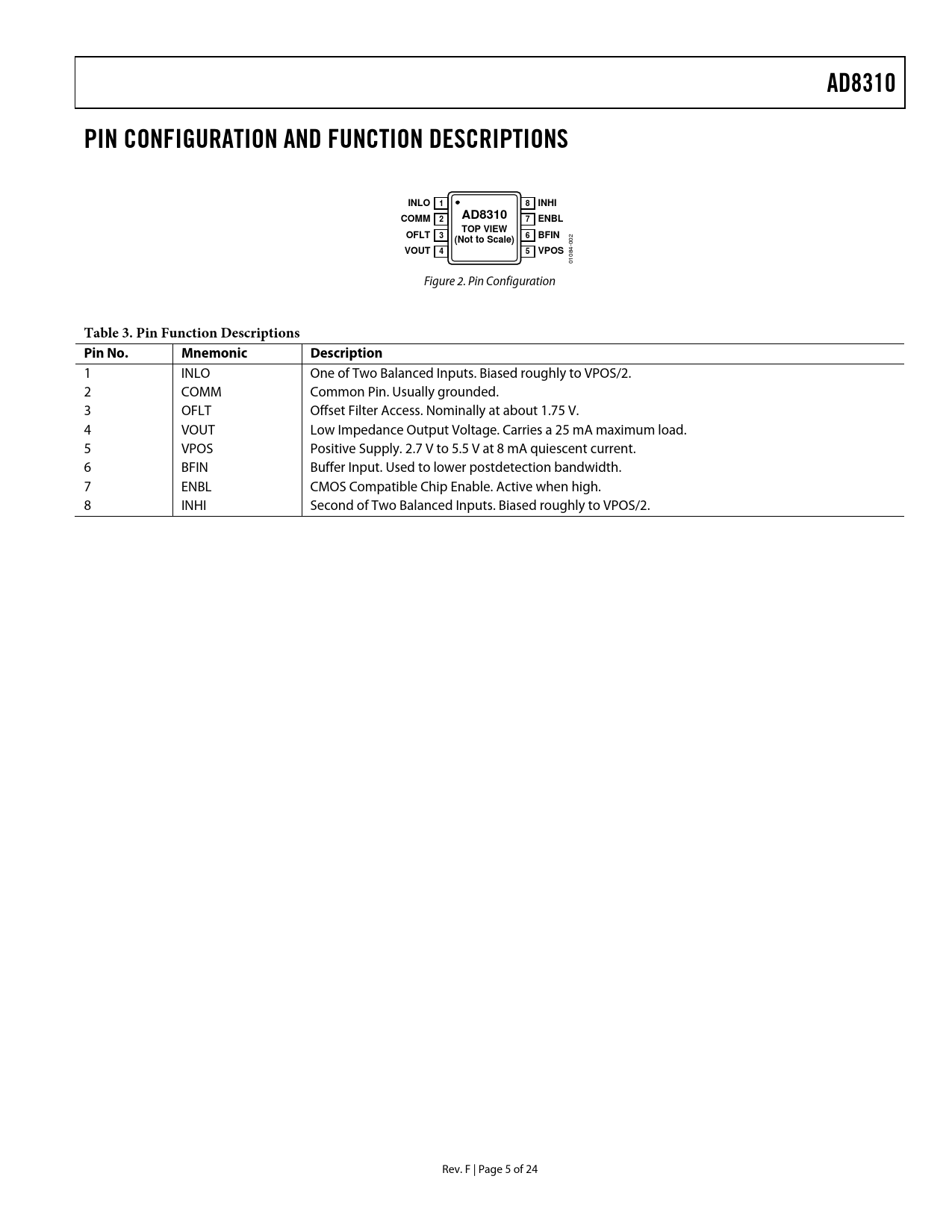 AD8310 PIN CONFIGURATION AND FUNCTION DESCRIPTIONS INLO 1 8 INHI COMM AD8310 2 7 ENBL TOP VIEW OFLT 3 6 BFIN (Not to Scale) VOUT 4 5 VPOS