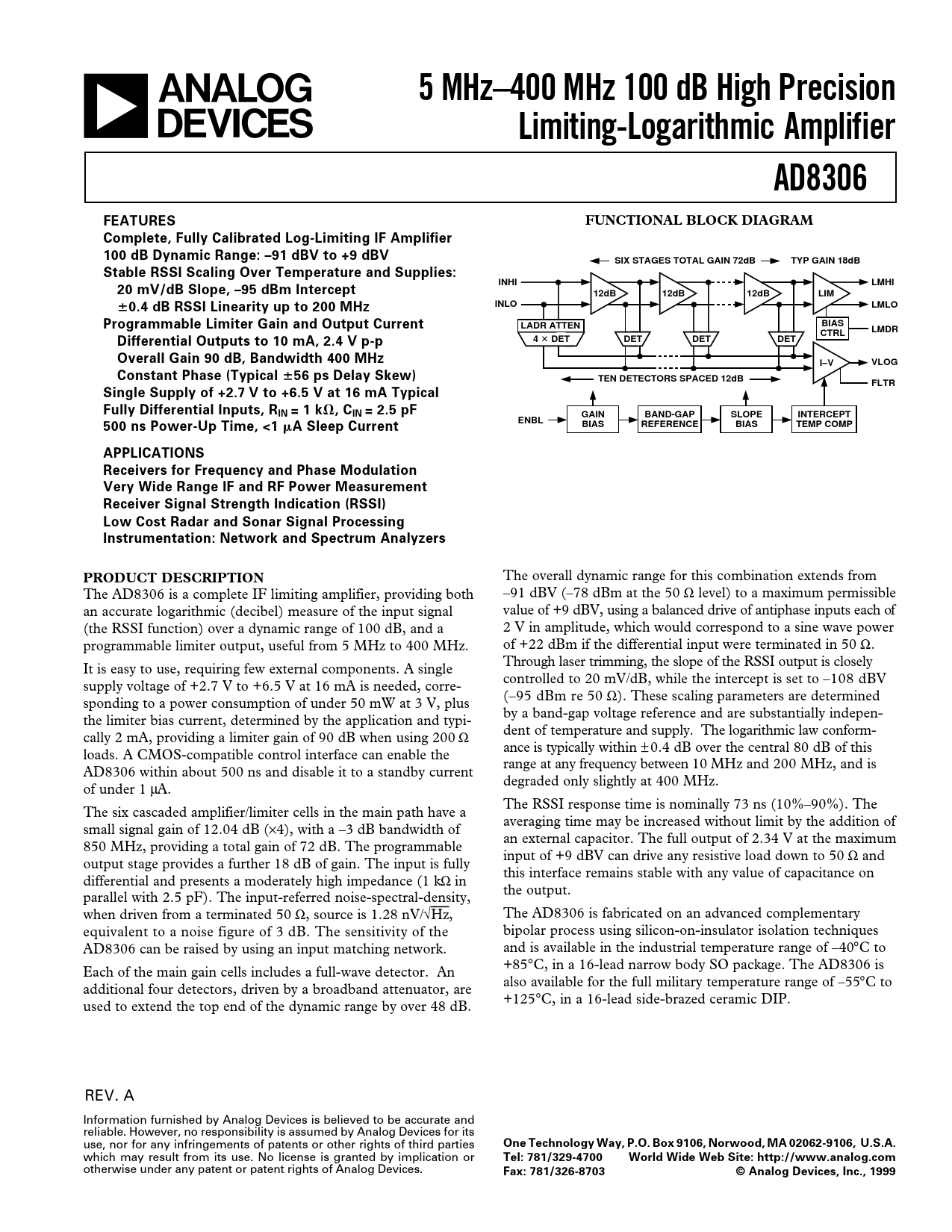 5 MHz–400 MHz 100 dB High Precision Limiting-Logarithmic Amplifier AD8306 FEATURES FUNCTIONAL BLOCK DIAGRAM Complete, Fully Calibrated Log-Limiting IF Amplifier 100 dB Dynamic Range: –91 dBV to +9 dBV SIX STAGES TOTAL GAIN 72dB TYP GAIN 18dB Stable RSSI Scaling Over Temperature and Supplies: INHI LMHI 20 mV/dB Slope, –95 dBm Intercept 12dB 12dB 12dB LIM