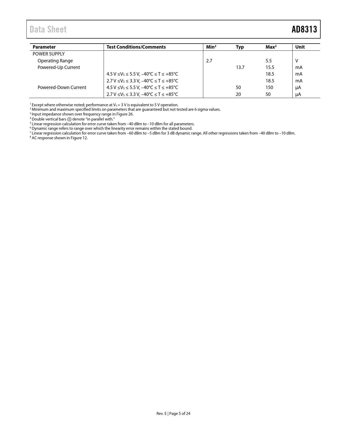 Seiten / Seite24 / 5 — Data Sheet. AD8313. Parameter. Test Conditions/Comments. Min2. Typ. Max2. …
