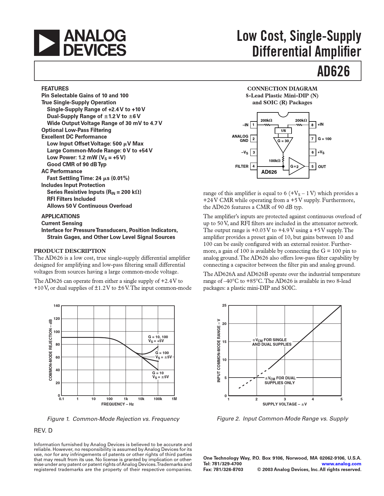 Low Cost, Single-Supply Differential Amplifi er AD626 FEATURES CONNECTION DIAGRAM Pin Selectable Gains of 10 and 100 8-Lead Plastic Mini-DIP (N) True Single-Supply Operation and SOIC (R) Packages Single-Supply Range of +2.4 V to +10 V Dual-Supply Range of