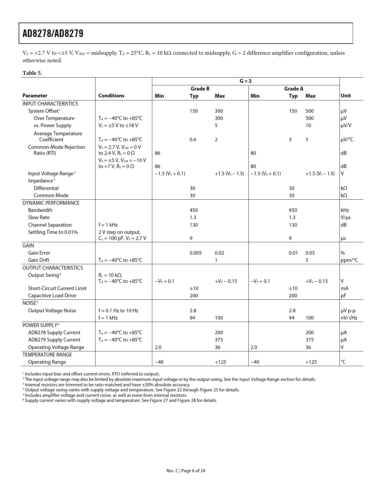 Seiten / Seite24 / 6 — AD8278/AD8279. Table 5. G = 2. Grade B. Grade A. Parameter Conditions. …