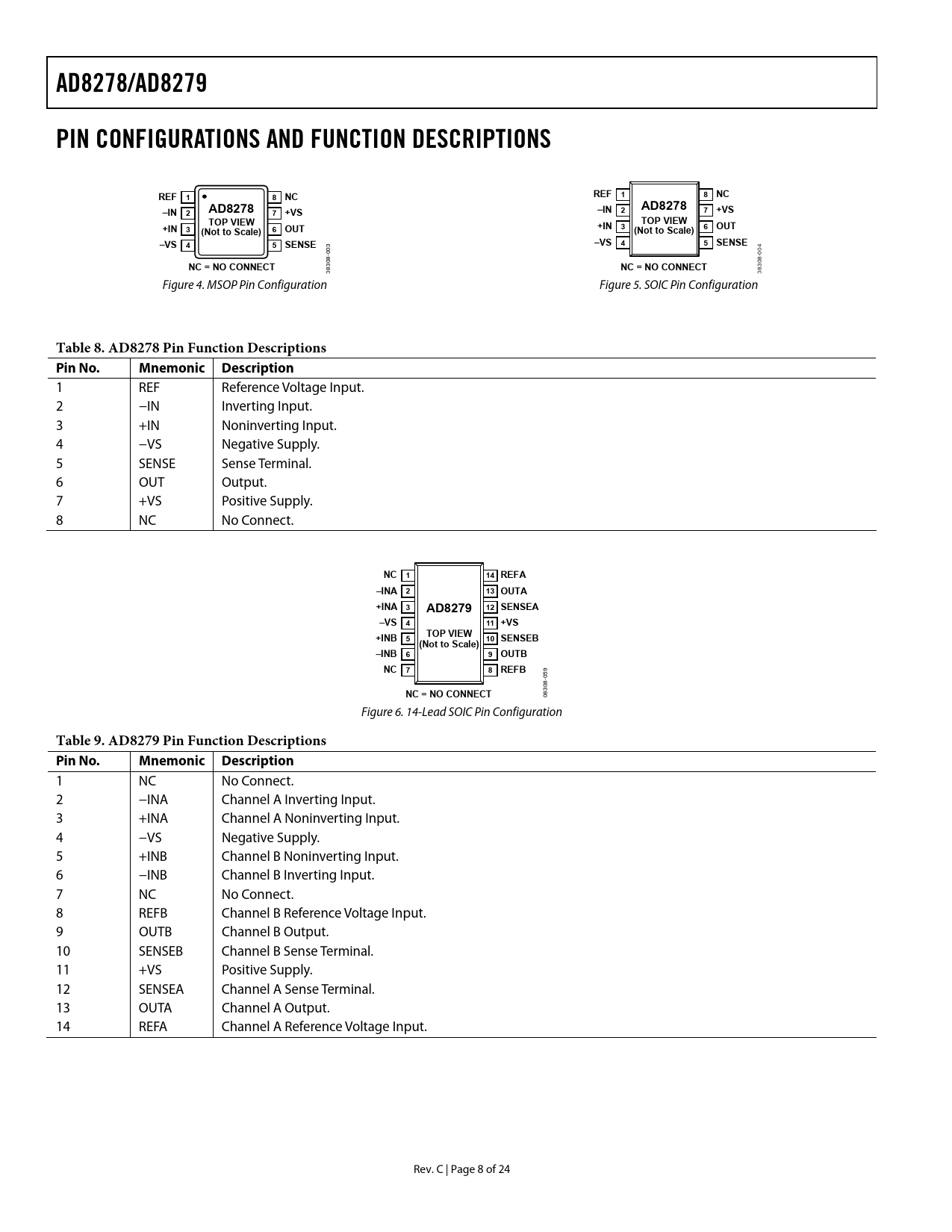 AD8278/AD8279. PIN CONFIGURATIONS AND FUNCTION DESCRIPTIONS. REF 1. 8 NC. AD8278. –IN. 7 +VS. –IN 2. TOP VIEW. +IN 3. 6 OUT. (Not to Scale)