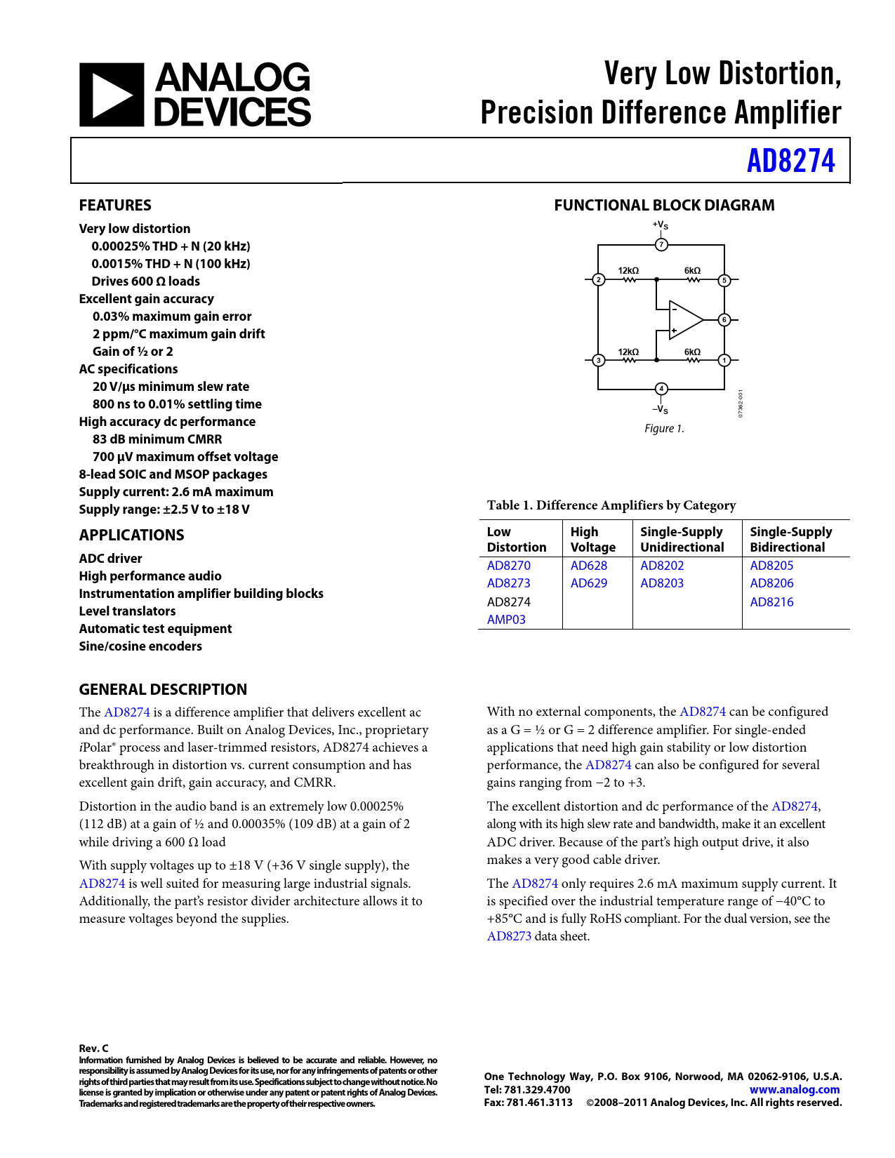| Seiten / Seite | 16 / 1 — Very Low Distortion,. Precision Difference Amplifier. AD8274. FEATURES. … |