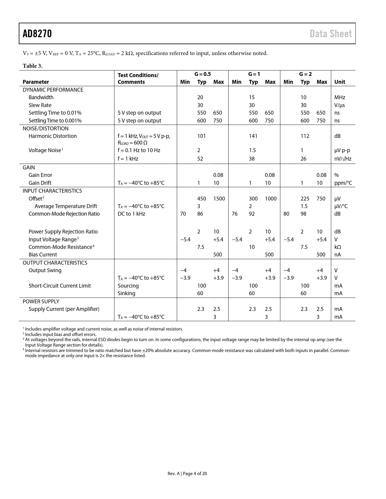 link to page 14 AD8270Data Sheet VS = ±5 V, VREF = 0 V, TA = 25°C, RLOAD = 2 kΩ, specifications referred to input, unless otherwise noted. Table 3.Test Conditions/G = 0.5G = 1G = 2ParameterCommentsMin Typ MaxMin Typ MaxMin Typ Max Unit DYNAMIC PERFORMANCE Bandwidth 20 15 10 MHz Slew Rate 30 30 30 V/µs Settling Time to 0.01% 5 V step on output 550 650 550 650 550 650 ns Settling Time to 0.001% 5 V step on output 600 750 600 750 600 750 ns NOISE/DISTORTION Harmonic Distortion f = 1 kHz, VOUT = 5 V p-p, 101 141 112 dB RLOAD = 600 Ω Voltage Noise1 f = 0.1 Hz to 10 Hz 2 1.5 1 µV p-p f = 1 kHz 52 38 26 nV/√Hz GAIN Gain Error 0.08 0.08 0.08 % Gain Drift TA = −40°C to +85°C 1 10 1 10 1 10 ppm/°C INPUT CHARACTERISTICS Offset2 450 1500 300 1000 225 750 µV Average Temperature Drift TA = −40°C to +85°C 3 2 1.5 µV/°C Common-Mode Rejection Ratio DC to 1 kHz 70 86 76 92 80 98 dB Power Supply Rejection Ratio 2 10 2 10 2 10 dB Input Voltage Range3 −5.4 +5.4 −5.4 +5.4 −5.4 +5.4 V Common-Mode Resistance4 7.5 10 7.5 kΩ Bias Current 500 500 500 nA OUTPUT CHARACTERISTICS Output Swing −4 +4 −4 +4 −4 +4 V TA = −40°C to +85°C −3.9 +3.9 −3.9 +3.9 −3.9 +3.9 V Short-Circuit Current Limit Sourcing 100 100 100 mA Sinking 60 60 60 mA POWER SUPPLY Supply Current (per Amplifier) 2.3 2.5 2.3 2.5 2.3 2.5 mA TA = −40°C to +85°C 3 3 3 mA 1 Includes amplifier voltage and current noise, as well as noise of internal resistors. 2 Includes input bias and offset errors. 3 At voltages beyond the rails, internal ESD diodes begin to turn on. In some configurations, the input voltage range may be limited by the internal op amp (see the Input Voltage Range section for details). 4 Internal resistors are trimmed to be ratio matched but have ±20% absolute accuracy. Common-mode resistance was calculated with both inputs in parallel. Common- mode impedance at only one input is 2× the resistance listed. Rev. A | Page 4 of 20 Document Outline FEATURES APPLICATIONS FUNCTIONAL BLOCK DIAGRAM GENERAL DESCRIPTION TABLE OF CONTENTS REVISION HISTORY SPECIFICATIONS DIFFERENCE AMPLIFIER CONFIGURATIONS ABSOLUTE MAXIMUM RATINGS THERMAL RESISTANCE MAXIMUM POWER DISSIPATION ESD CAUTION PIN CONFIGURATION AND FUNCTION DESCRIPTIONS TYPICAL PERFORMANCE CHARACTERISTICS THEORY OF OPERATION CIRCUIT INFORMATION DC Performance AC Performance Production Costs Size DRIVING THE AD8270 PACKAGE CONSIDERATIONS POWER SUPPLIES INPUT VOLTAGE RANGE APPLICATIONS INFORMATION DIFFERENCE AMPLIFIER CONFIGURATIONS SINGLE-ENDED CONFIGURATIONS Gain of 1 Configuration DIFFERENTIAL OUTPUT DRIVING AN ADC DRIVING CABLING OUTLINE DIMENSIONS ORDERING GUIDE