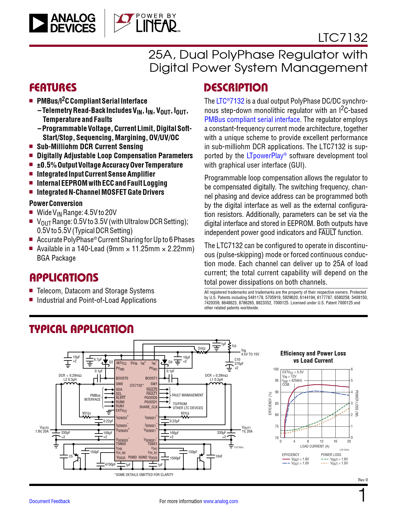 LTC7132 25A, Dual PolyPhase Regulator with Digital Power System Management FEATURESDESCRIPTION n PMBus/I2C Compliant Serial Interface The LTC®7132 is a dual output PolyPhase DC/DC synchro- – Telemetry Read-Back Includes VIN, IIN, VOUT, IOUT, nous step-down monolithic regulator with an I2C-based Temperature and Faults PMBus compliant serial interface. The regulator employs – Programmable Voltage, Current Limit, Digital Soft- a constant-frequency current mode architecture, together Start/Stop, Sequencing, Margining, OV/UV/OC with a unique scheme to provide excellent performance n Sub-Milliohm DCR Current Sensing in sub-milliohm DCR applications. The LTC7132 is sup- n Digitally Adjustable Loop Compensation Parameters ported by the LTpowerPlay® software development tool n ±0.5% Output Voltage Accuracy Over Temperature with graphical user interface (GUI). n Integrated Input Current Sense Amplifier Programmable loop compensation allows the regulator to n Internal EEPROM with ECC and Fault Logging be compensated digitally. The switching frequency, chan- n Integrated N-Channel MOSFET Gate Drivers nel phasing and device address can be programmed both Power Conversion by the digital interface as well as the external configura- n Wide VIN Range: 4.5V to 20V tion resistors. Additionally, parameters can be set via the n VOUT Range: 0.5V to 3.5V (with Ultralow DCR Setting); digital interface and stored in EEPROM. Both outputs have 0.5V to 5.5V (Typical DCR Setting) independent power good indicators and FAULT function. n Accurate PolyPhase® Current Sharing for Up to 6 Phases n The LTC7132 can be configured to operate in discontinu- Available in a 140-Lead (9mm × 11.25mm × 2.22mm) ous (pulse-skipping) mode or forced continuous conduc- BGA Package tion mode. Each channel can deliver up to 25A of load current; the total current capability will depend on the APPLICATIONS total power dissipations on both channels. n Telecom, Datacom and Storage Systems All registered trademarks and trademarks are the property of their respective owners. Protected by U.S. Patents including 5481178, 5705919, 5929620, 6144194, 6177787, 6580258, 5408150, n Industrial and Point-of-Load Applications 7420359, 8648623, 8786265, 8823352, 7000125. Licensed under U.S. Patent 7000125 and other related patents worldwide. TYPICAL APPLICATION 1µF 1Ω 2mΩ VIN 4.5V TO 15V Efficiency and Power Loss 10µF 4.7µF 10µF ×2 C10 D2 INTV + – D4 ×2 SV I I vs Load Current CC IN IN IN 270µF PVIN0 PVIN1 ×2 0.1µF 0.1µF 100 6 EXTVCC = 5.5V DCR = 0.29mΩ DCR = 0.29mΩ BOOST0 BOOST1 VIN = 12V L2 0.3µH L1 0.3µH 95 fSW = 425kHz 5 SW0 SW1 LTC7132* CCM SDA FAULT0 POWER LOSS (W) SCL FAULT1 90 4 PMBus FAULT MANAGEMENT ALERT PGOOD0 INTERFACE RUN0 PGOOD1 TO/FROM 85 3 RUN1 SHARE_CLK OTHER LTC DEVICES EXTVCC 931Ω 931Ω EFFICIENCY (%) 2 I + + 80 SENSE0 ISENSE1 0.22µF 0.22µF I – I – V SENSE0 SENSE1 OUT0 V 75 1 V + + OUT1 1.8V, 20A SENSE0 VSENSE1 1V, 20A 330µF 100µF 100µF 330µF ×2 ×2 ×2 V – – ×2 70 0 SENSE0 VSENSE1 0 4 8 12 16 20 TSNS0 TSNS1 I LOAD CURRENT (A) TH0 ITH1 7132 TA01a 150pF 7132 TA01b ITH_R0 ITH_R1 150pF C5 EFFICIENCY POWER LOSS VDD33 PGND SGND V 10nF DD25 1500pF VOUT = 1.8V VOUT = 1.8V 4700pF 1µF 1µF VOUT = 1.0V VOUT = 1.0V *SOME DETAILS OMITTED FOR CLARITY Rev 0 Document Feedback For more information www.analog.com 1 Document Outline Features Applications Typical Application Description Table of Contents Absolute Maximum Ratings Order Information Pin Configuration Electrical Characteristics Typical Performance Characteristics Pin Functions Block Diagram Operation Overview Main Control Loop EEPROM Power-Up and Initialization Soft-Start Time-Based Sequencing Voltage-Based Sequencing Shutdown Light-Load Current Operation Switching Frequency and Phase PWM Loop Compensation Output Voltage Sensing INTVCC/EXTVCC Power Output Current Sensing and Sub-Milliohm DCR Current Sensing Input Current Sensing PolyPhase Load Sharing External/Internal Temperature Sense RCONFIG (Resistor Configuration) Pins Fault Detection and Handling Status Registers and ALERT Masking Mapping Faults to FAULT Pins Power Good Pins CRC Protection Serial Interface Communication Protection Device Addressing Responses to VOUT and IIN/IOUT Faults Output Overvoltage Fault Response Output Undervoltage Response Peak Output Overcurrent Fault Response Responses to Timing Faults Responses to VIN OV Faults Responses to OT/UT Faults Internal Overtemperature Fault Response External Overtemperature and Undertemperature Fault Response Responses to Input Overcurrent and Output Undercurrent Faults Responses to External Faults Fault Logging Bus Timeout Protection Similarity Between PMBus, SMBus and I2C 2-Wire Interface PMBus Serial Digital Interface PMBus Command Summary PMBus Commands *Data Format Applications Information Current Limit Programming ISENSE0± and ISENSE1± Pins Inductor DCR Sensing Inductor Value Calculation Inductor Core Selection Low Value Resistor Current Sensing Slope Compensation and Inductor Peak Current Variable Delay Time, Soft-Start and Output Voltage Ramping Digital Servo Mode Soft Off (Sequenced Off) INTVCC/EXTVCC Power Topside MOSFET Driver Supply (CB, DB) Undervoltage Lockout CIN and COUT Selection Fault INDICATION Open-Drain Pins Phase-Locked Loop and Frequency Synchronization Minimum On-Time Considerations External Temperature Sense Input Current Sense Amplifier External Resistor Configuration Pins (RCONFIG) Voltage Selection Frequency Selection Phase Selection Address Selection Using RCONFIG Efficiency Considerations Thermal Considerations Programmable Loop Compensation Checking Transient Response PolyPhase Configuration PC Board Layout Checklist PC Board Layout Debugging Design Example Additional Design Checks Connecting the USB to I2C/SMBus/PMBus Controller to the LTC7132 in System LTpowerPlay: An Interactive GUI for Digital Power PMBus Communication and Command Processing PMBus Command Details Addressing and Write Protect General Con