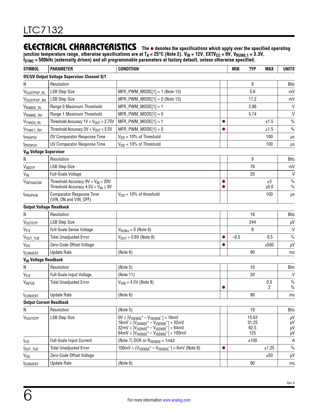N Resolution (Note 5) 10 Bits V + – IOUTSTP LSB Step Size 0V ≤ |VISENSE – VISENSE | < 16mV 15.63 µV 16mV ≤ |V + – ISENSE – VISENSE | < 32mV 31.25 µV 32mV ≤ |V + – ISENSE – VISENSE | < 64mV 62.5 µV 64mV ≤ |V + – ISENSE – VISENSE | < 100mV 125 µV IF/S Full-Scale Input Current (Note 7) DCR or RISENSE = 1mΩ ±100 A I + – OUT_TUE Total Unadjusted Error 100mV > (VISENSE – VISENSE ) > 6mV (Note 8) l ±1.25 % VOS Zero-Code Offset Voltage ±50 µV tCONVERT Update Rate (Note 6) 90 ms Rev 0 6 For more information www.analog.com Document Outline Features Applications Typical Application Description Table of Contents Absolute Maximum Ratings Order Information Pin Configuration Electrical Characteristics Typical Performance Characteristics Pin Functions Block Diagram Operation Overview Main Control Loop EEPROM Power-Up and Initialization Soft-Start Time-Based Sequencing Voltage-Based Sequencing Shutdown Light-Load Current Operation Switching Frequency and Phase PWM Loop Compensation Output Voltage Sensing INTVCC/EXTVCC Power Output Current Sensing and Sub-Milliohm DCR Current Sensing Input Current Sensing PolyPhase Load Sharing External/Internal Temperature Sense RCONFIG (Resistor Configuration) Pins Fault Detection and Handling Status Registers and ALERT Masking Mapping Faults to FAULT Pins Power Good Pins CRC Protection Serial Interface Communication Protection Device Addressing Responses to VOUT and IIN/IOUT Faults Output Overvoltage Fault Response Output Undervoltage Response Peak Output Overcurrent Fault Response Responses to Timing Faults Responses to VIN OV Faults Responses to OT/UT Faults Internal Overtemperature Fault Response External Overtemperature and Undertemperature Fault Response Responses to Input Overcurrent and Output Undercurrent Faults Responses to External Faults Fault Logging Bus Timeout Protection Similarity Between PMBus, SMBus and I2C 2-Wire Interface PMBus Serial Digital Interface PMBus Command Summary PMBus Commands *Data Format Applications Information Current Limit Programming ISENSE0± and ISENSE1± Pins Inductor DCR Sensing Inductor Value Calculation Inductor Core Selection Low Value Resistor Current Sensing Slope Compensation and Inductor Peak Current Variable Delay Time, Soft-Start and Output Voltage Ramping Digital Servo Mode Soft Off (Sequenced Off) INTVCC/EXTVCC Power Topside MOSFET Driver Supply (CB, DB) Undervoltage Lockout CIN and COUT Selection Fault INDICATION Open-Drain Pins Phase-Locked Loop and Frequency Synchronization Minimum On-Time Considerations External Temperature Sense Input Current Sense Amplifier External Resistor Configuration Pins (RCONFIG) Voltage Selection Frequency Selection Phase Selection Address Selection Using RCONFIG Efficiency Considerations Thermal Considerations Programmable Loop Compensation Checking Transient Response PolyPhase Configuration PC Board Layout Checklist PC Board Layout Debugging Design Example Additional Design Checks Connecting the USB to I2C/SMBus/PMBus Controller to the LTC7132 in System LTpowerPlay: An Interactive GUI for Digital Power PMBus Communication and Command Processing PMBus Command Details Addressing and Write Protect General Configuration Commands On/Off/Margin PWM Configuration Voltage Input Voltage and Limits Output Voltage and Limits Output Current and Limits Input Current and Limits Temperature External Temperature Calibration Timing Timing—On Sequence/Ramp Timing—Off Sequence/Ramp Precondition for Restart Fault Response Fault Responses All Faults Fault Responses Input Voltage Fault Responses Output Voltage Fault Responses Output Current Fault Responses IC Temperature Fault Responses External Temperature Fault Sharing Fault Sharing Propagation Fault Sharing Response Scratchpad Identification Fault Warning and Status Telemetry NVM Memory Commands Store/Restore Fault Logging Block Memory Write/Read Typical Applications Package Description Typical Application Related Parts