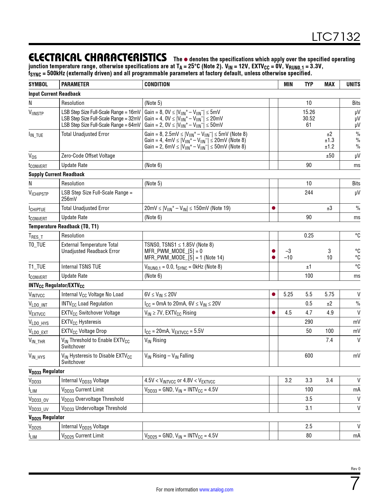 denotes the specifications which apply over the specified operating junction temperature range, otherwise specifications are at TA = 25°C (Note 2). VIN = 12V, EXTVCC = 0V, VRUN0,1 = 3.3V, fSYNC = 500kHz (externally driven) and all programmable parameters at factory default, unless otherwise specified. SYMBOL PARAMETER CONDITION MIN TYP MAX UNITS Input Current Readback