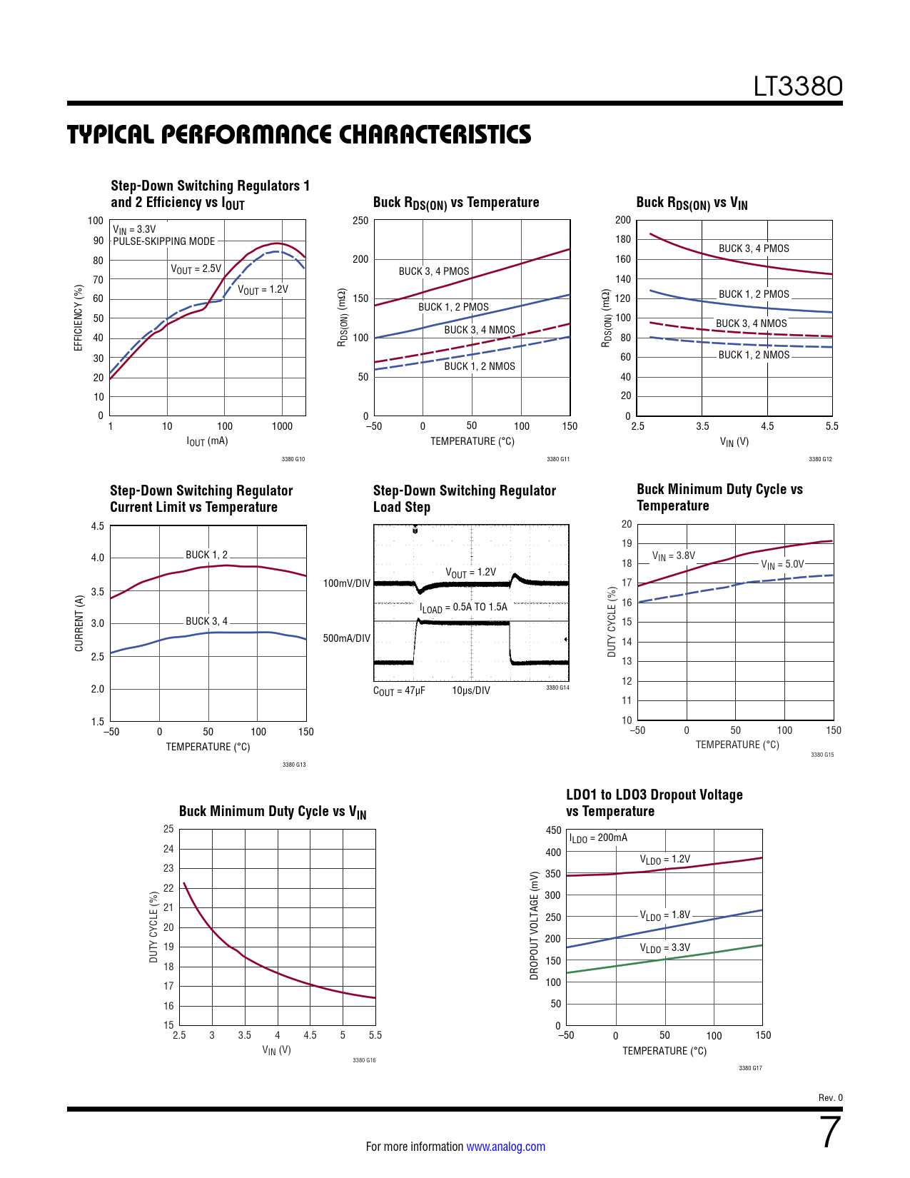100 250 200 VIN = 3.3V 90 PULSE-SKIPPING MODE 180 BUCK 3, 4 PMOS 80 200 160 VOUT = 2.5V BUCK 3, 4 PMOS 70 140 V 60 OUT = 1.2V 150 120 BUCK 1, 2 PMOS (mΩ) BUCK 1, 2 PMOS (mΩ) 50 100 BUCK 3, 4 NMOS BUCK 3, 4 NMOS 40 100 80 EFFICIENCY (%) R DS(ON) R DS(ON) 30 60 BUCK 1, 2 NMOS BUCK 1, 2 NMOS 20 50 40 10 20 0 0 0 1 10 100 1000 –50 0 50 100 150 2.5 3.5 4.5 5.5 IOUT (mA) TEMPERATURE (°C) VIN (V) 3380 G10 3380 G11 3380 G12