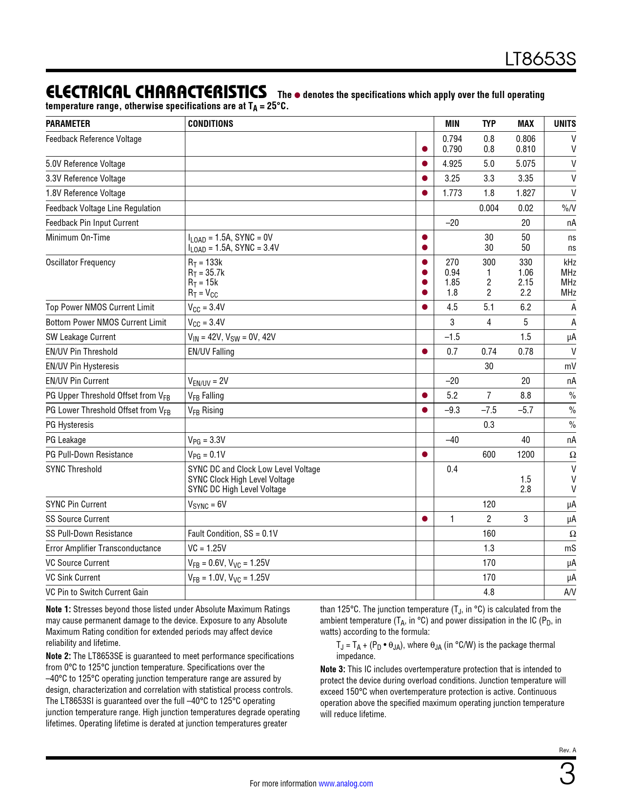 Feedback Reference Voltage 0.794 0.8 0.806 V l 0.790 0.8 0.810 V 5.0V Reference Voltage l 4.925 5.0 5.075 V 3.3V Reference Voltage l 3.25 3.3 3.35 V 1.8V Reference Voltage l 1.773 1.8 1.827 V Feedback Voltage Line Regulation 0.004 0.02 %/V Feedback Pin Input Current –20 20 nA Minimum On-Time ILOAD = 1.5A, SYNC = 0V l 30 50 ns ILOAD = 1.5A, SYNC = 3.4V l 30 50 ns Oscillator Frequency RT = 133k l 270 300 330 kHz RT = 35.7k l 0.94 1 1.06 MHz RT = 15k l 1.85 2 2.15 MHz RT = VCC l 1.8 2 2.2 MHz Top Power NMOS Current Limit VCC = 3.4V l 4.5 5.1 6.2 A Bottom Power NMOS Current Limit VCC = 3.4V 3 4 5 A SW Leakage Current VIN = 42V, VSW = 0V, 42V –1.5 1.5 µA EN/UV Pin Threshold EN/UV Falling l 0.7 0.74 0.78 V EN/UV Pin Hysteresis 30 mV EN/UV Pin Current VEN/UV = 2V –20 20 nA PG Upper Threshold Offset from VFB VFB Falling l 5.2 7 8.8 % PG Lower Threshold Offset from VFB VFB Rising l –9.3 –7.5 –5.7 % PG Hysteresis 0.3 % PG Leakage VPG = 3.3V –40 40 nA PG Pull-Down Resistance VPG = 0.1V l 600 1200 Ω SYNC Threshold SYNC DC and Clock Low Level Voltage 0.4 V SYNC Clock High Level Voltage 1.5 V SYNC DC High Level Voltage 2.8 V SYNC Pin Current VSYNC = 6V 120 µA SS Source Current l 1 2 3 µA SS Pull-Down Resistance Fault Condition, SS = 0.1V 160 Ω Error Amplifier Transconductance VC = 1.25V 1.3 mS VC Source Current VFB = 0.6V, VVC = 1.25V 170 µA VC Sink Current VFB = 1.0V, VVC = 1.25V 170 µA VC Pin to Switch Current Gain 4.8 A/V