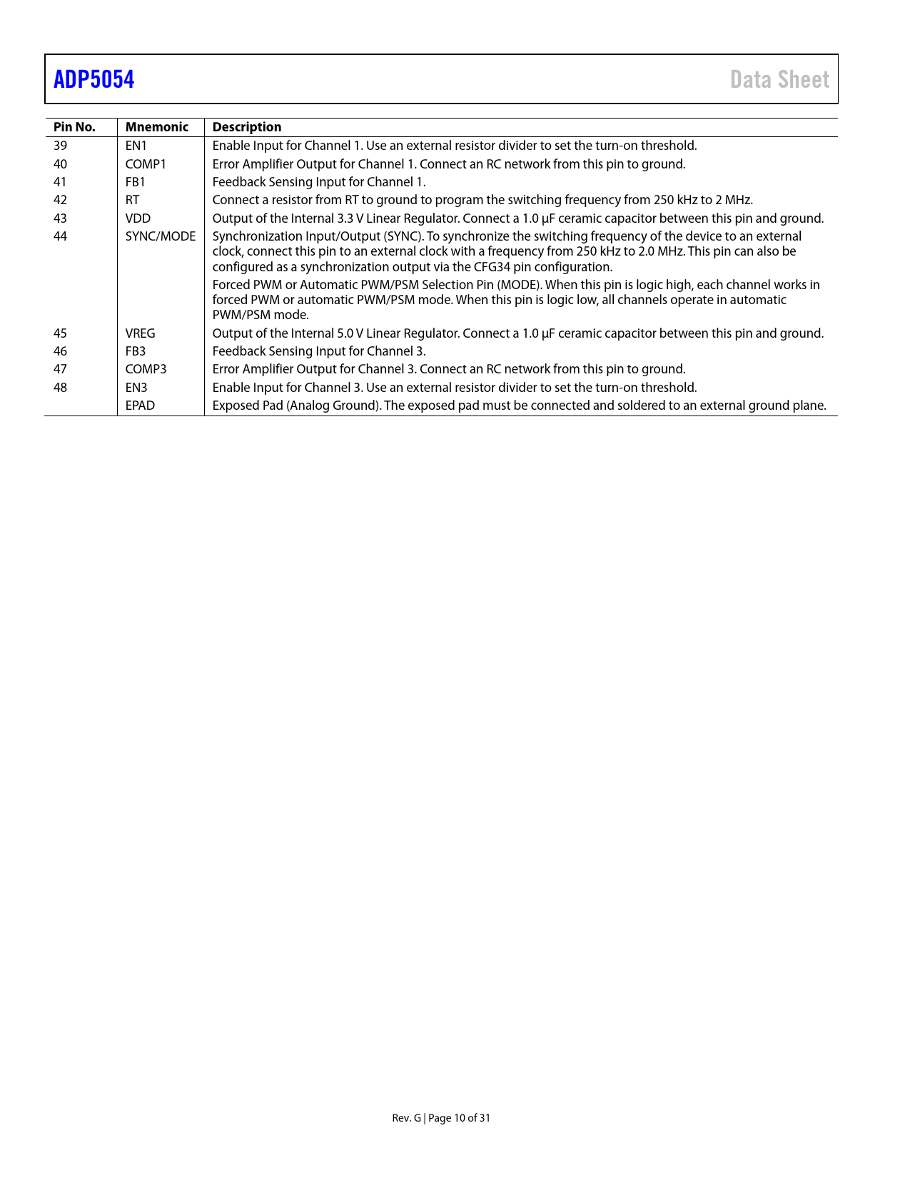 ADP5054Data SheetPin No.MnemonicDescription 39 EN1 Enable Input for Channel 1. Use an external resistor divider to set the turn-on threshold. 40 COMP1 Error Amplifier Output for Channel 1. Connect an RC network from this pin to ground. 41 FB1 Feedback Sensing Input for Channel 1. 42 RT Connect a resistor from RT to ground to program the switching frequency from 250 kHz to 2 MHz. 43 VDD Output of the Internal 3.3 V Linear Regulator. Connect a 1.0 μF ceramic capacitor between this pin and ground. 44 SYNC/MODE Synchronization Input/Output (SYNC). To synchronize the switching frequency of the device to an external clock, connect this pin to an external clock with a frequency from 250 kHz to 2.0 MHz. This pin can also be configured as a synchronization output via the CFG34 pin configuration. Forced PWM or Automatic PWM/PSM Selection Pin (MODE). When this pin is logic high, each channel works in forced PWM or automatic PWM/PSM mode. When this pin is logic low, all channels operate in automatic PWM/PSM mode. 45 VREG Output of the Internal 5.0 V Linear Regulator. Connect a 1.0 μF ceramic capacitor between this pin and ground. 46 FB3 Feedback Sensing Input for Channel 3. 47 COMP3 Error Amplifier Output for Channel 3. Connect an RC network from this pin to ground. 48 EN3 Enable Input for Channel 3. Use an external resistor divider to set the turn-on threshold. EPAD Exposed Pad (Analog Ground). The exposed pad must be connected and soldered to an external ground plane. Rev. G | Page 10 of 31 Document Outline FEATURES APPLICATIONS TYPICAL APPLICATION CIRCUIT GENERAL DESCRIPTION TABLE OF CONTENTS REVISION HISTORY DETAILED FUNCTIONAL BLOCK DIAGRAM SPECIFICATIONS BUCK REGULATOR SPECIFICATIONS ABSOLUTE MAXIMUM RATINGS THERMAL RESISTANCE ESD CAUTION PIN CONFIGURATION AND FUNCTION DESCRIPTIONS TYPICAL PERFORMANCE CHARACTERISTICS THEORY OF OPERATION BUCK REGULATOR OPERATIONAL MODES PWM Mode PSM Mode Forced PWM and Automatic PWM/PSM Modes ADJUSTABLE AND FIXED OUTPUT VOLTAGE INTERNAL REGULATORS (VREG AND VDD) SEPARATE SUPPLY APPLICATIONS LOW-SIDE DEVICE SELECTION BOOTSTRAP CIRCUITRY ACTIVE OUTPUT DISCHARGE SWITCH PRECISION ENABLING OSCILLATOR Phase Shift SYNCHRONIZATION INPUT/OUTPUT SOFT START PARALLEL OPERATION STARTUP WITH PRECHARGED OUTPUT CURRENT-LIMIT PROTECTION FREQUENCY FOLDBACK PULSE SKIP IN MAXIMUM DUTY SHORT-CIRCUIT PROTECTION (SCP) LATCH-OFF PROTECTION Short-Circuit Latch-Off Mode UNDERVOLTAGE LOCKOUT (UVLO) POWER-GOOD FUNCTION THERMAL SHUTDOWN APPLICATIONS INFORMATION ADIsimPOWER DESIGN TOOL PROGRAMMING THE OUTPUT VOLTAGE VOLTAGE CONVERSION LIMITATIONS CURRENT-LIMIT SETTING SOFT START SETTING INDUCTOR SELECTION OUTPUT CAPACITOR SELECTION INPUT CAPACITOR SELECTION LOW-SIDE POWER DEVICE SELECTION PROGRAMMING THE UVLO INPUT COMPENSATION COMPONENTS DESIGN POWER DISSIPATION Buck Regulator Power Dissipation Power Switch Conduction Loss (PCOND) Switching Loss (PSW) Transition Loss (PTRAN) Thermal Shutdown JUNCTION TEMPERATURE DESIGN EXAMPLES SETTING THE SWITCHING FREQUENCY SETTING THE OUTPUT VOLTAGE SETTING THE CURRENT LIMIT SELECTING THE INDUCTOR SELECTING THE OUTPUT CAPACITOR SELECTING THE LOW-SIDE MOSFET DESIGNING THE COMPENSATION NETWORK SELECTING THE SOFT START TIME SELECTING THE INPUT CAPACITOR PRINTED CIRCUIT BOARD LAYOUT RECOMMENDATIONS TYPICAL APPLICATION CIRCUIT FACTORY DEFAULT OPTIONS OUTLINE DIMENSIONS ORDERING GUIDE