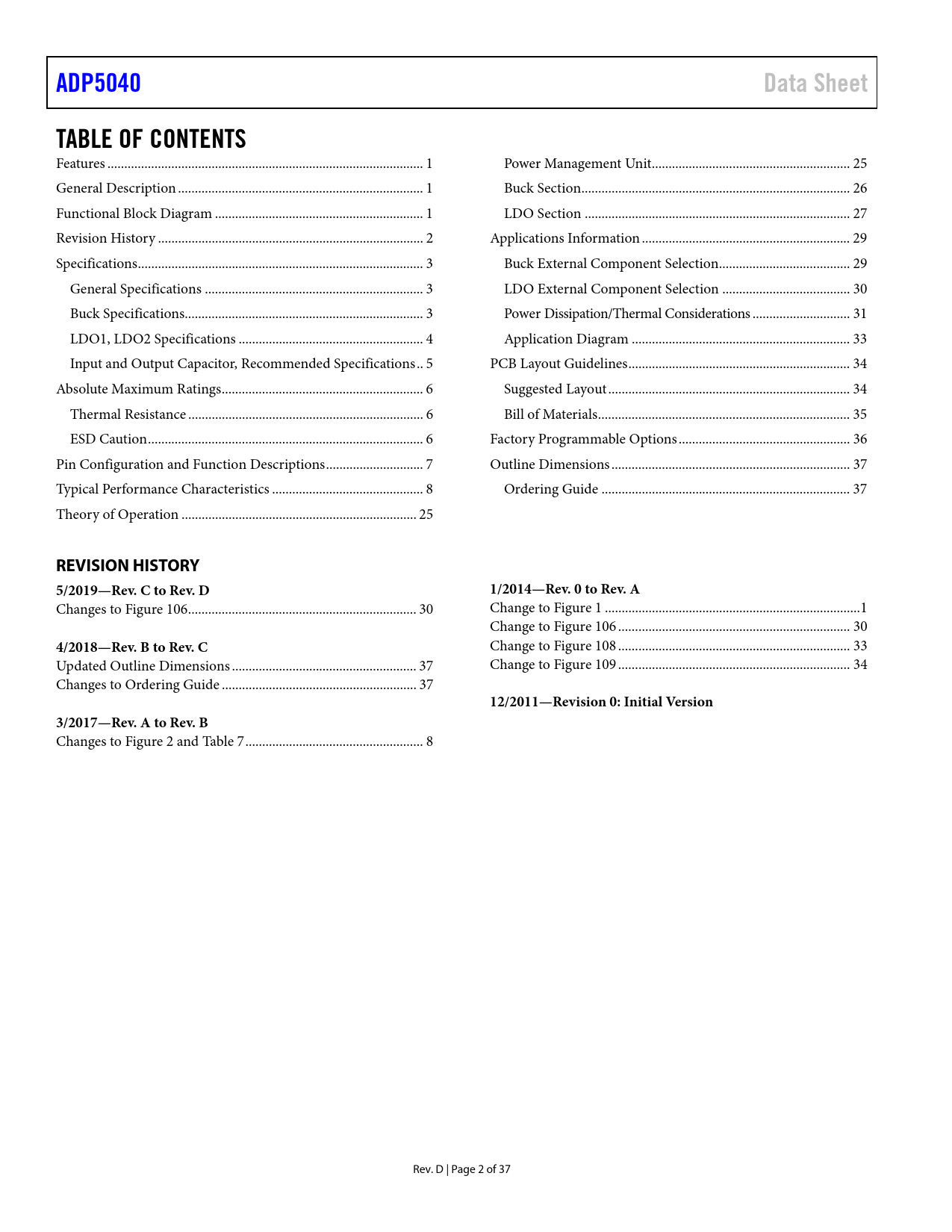 Seiten / Seite37 / 2 — ADP5040. Data Sheet. TABLE OF CONTENTS. REVISION HISTORY. 5/2019—Rev. C …
