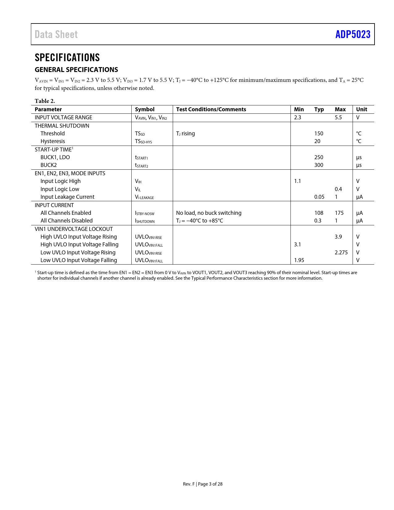 Data Sheet. ADP5023. SPECIFICATIONS GENERAL SPECIFICATIONS. Table 2. Parameter Symbol. Test. Conditions/Comments. Min. Typ. Max. Unit