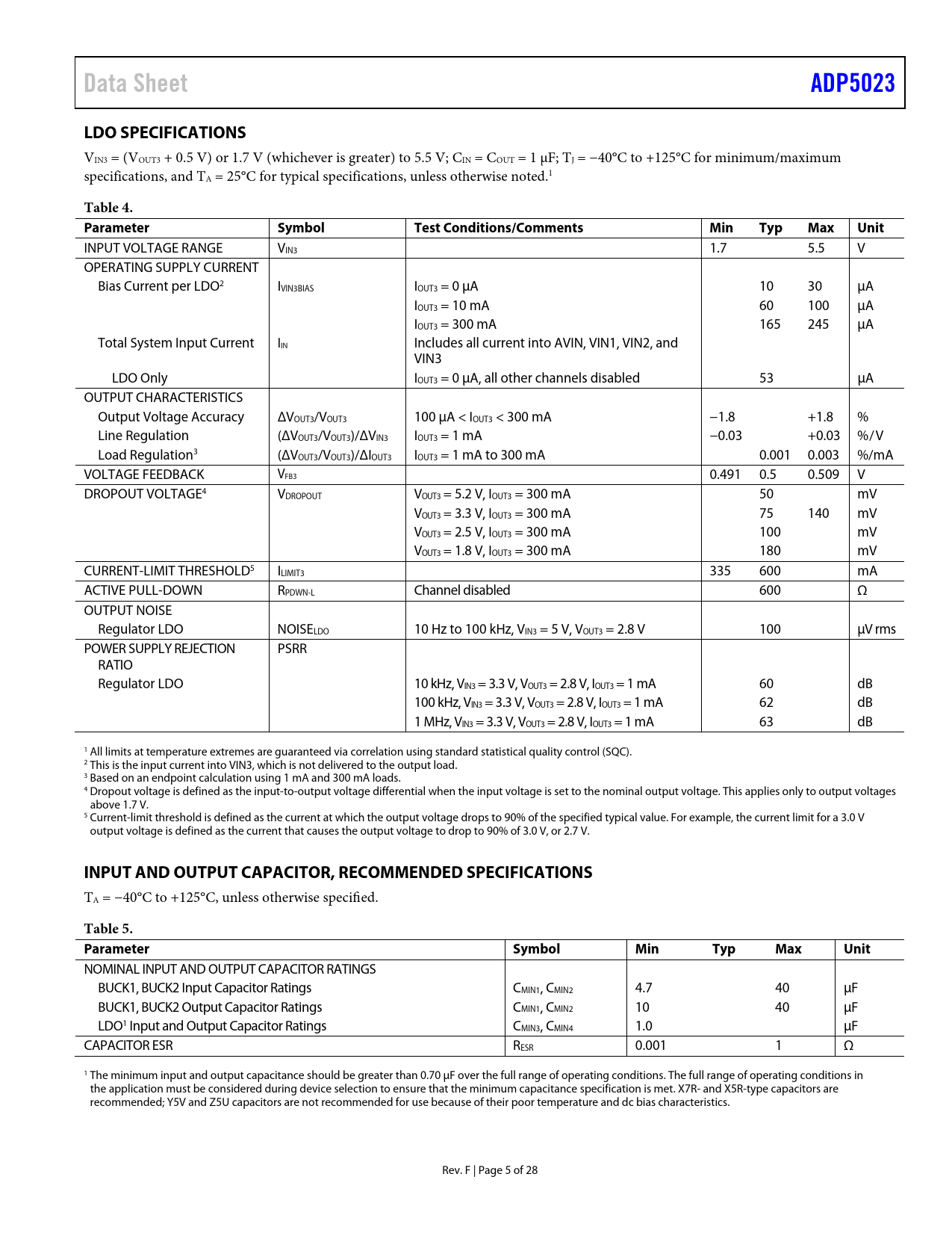 Data Sheet. ADP5023. LDO SPECIFICATIONS. Table 4. Parameter. Symbol. Test Conditions/Comments Min. Typ. Max. Unit