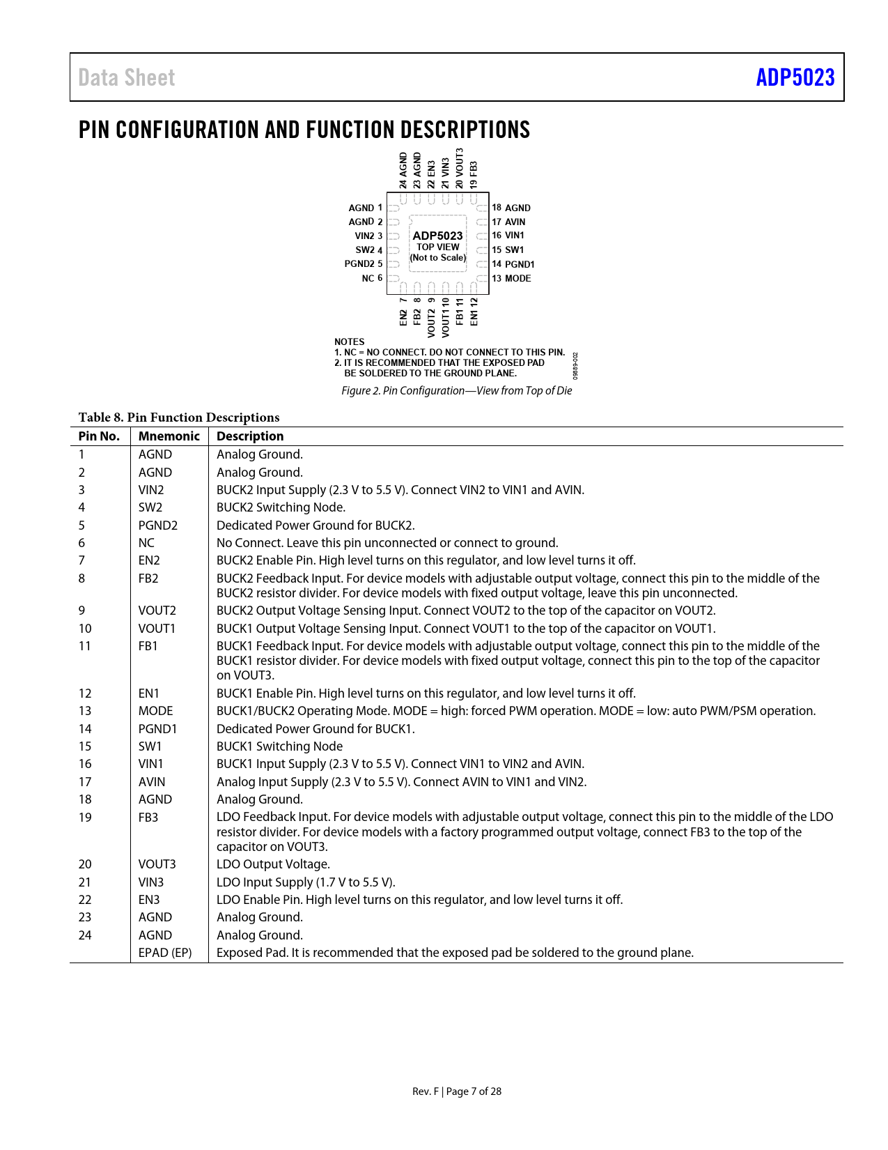 Seiten / Seite28 / 7 — Data Sheet. ADP5023. PIN CONFIGURATION AND FUNCTION DESCRIPTIONS. AGND 1. …