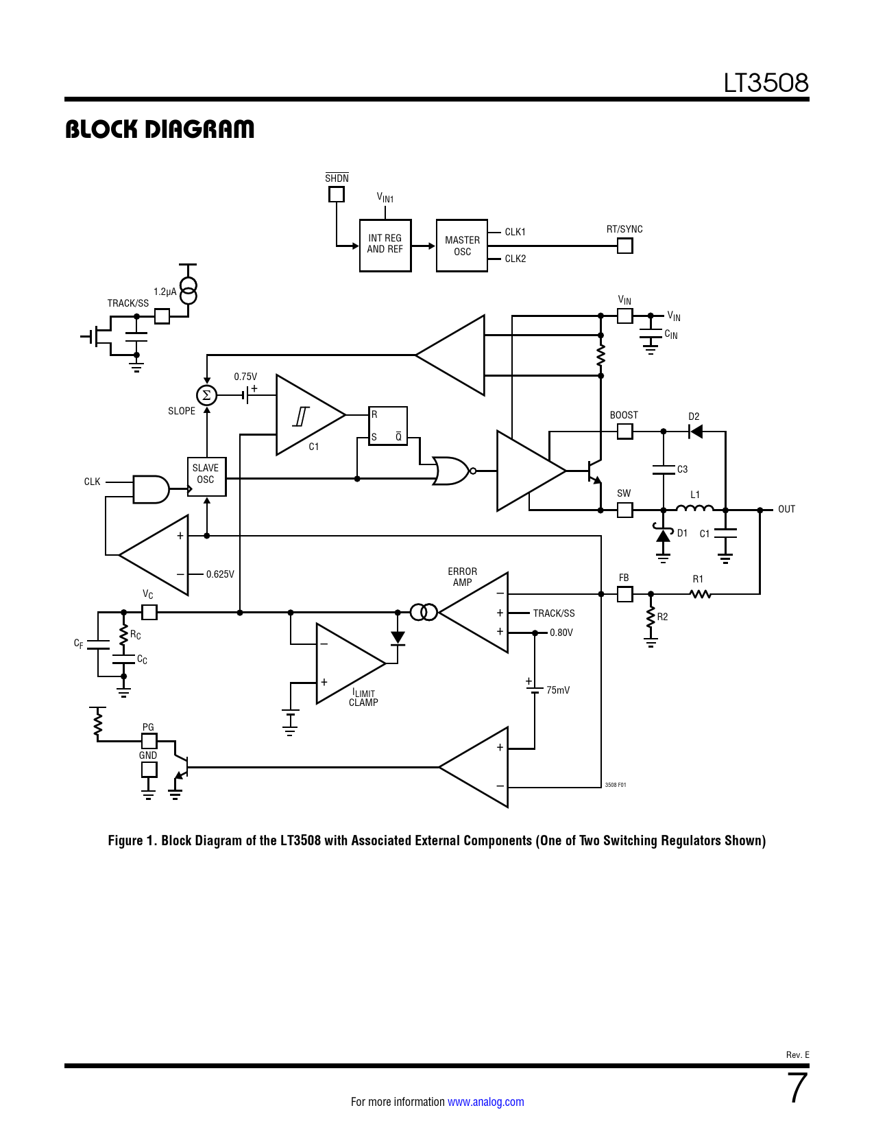 SHDN VIN1 RT/SYNC INT REG CLK1 MASTER AND REF OSC CLK2 1.2µA TRACK/SS VIN VIN CIN 0.75V+ Σ SLOPE R BOOST D2 S Q C1 SLAVE C3 CLK OSC SW L1 OUT + D1 C1 – ERROR 0.625V AMP – FB R1 VC + TRACK/SS + R2 RC – 0.80V CF CC + + I 75mV LIMIT CLAMP PG + GND – 3508 F01