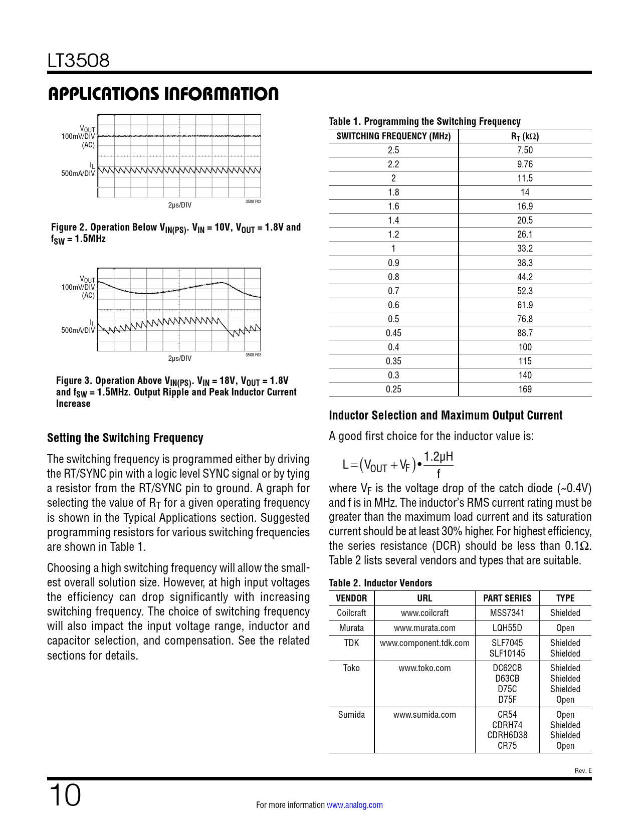 A good first choice for the inductor value is: The switching frequency is programmed either by driving 1.2µH L = (V )• the RT/SYNC pin with a logic level SYNC signal or by tying OUT + VF f a resistor from the RT/SYNC pin to ground. A graph for where VF is the voltage drop of the catch diode (~0.4V) selecting the value of RT for a given operating frequency and f is in MHz. The inductor’s RMS current rating must be is shown in the Typical Applications section. Suggested greater than the maximum load current and its saturation programming resistors for various switching frequencies current should be at least 30% higher. For highest efficiency, are shown in Table 1. the series resistance (DCR) should be less than 0.1Ω. Table 2 lists several vendors and types that are suitable. Choosing a high switching frequency will allow the small- est overall solution size. However, at high input voltages