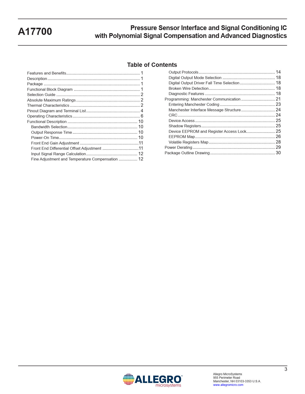 Pressure Sensor Interface and Signal Conditioning IC A17700 with Polynomial Signal Compensation and Advanced Diagnostics Table of Contents