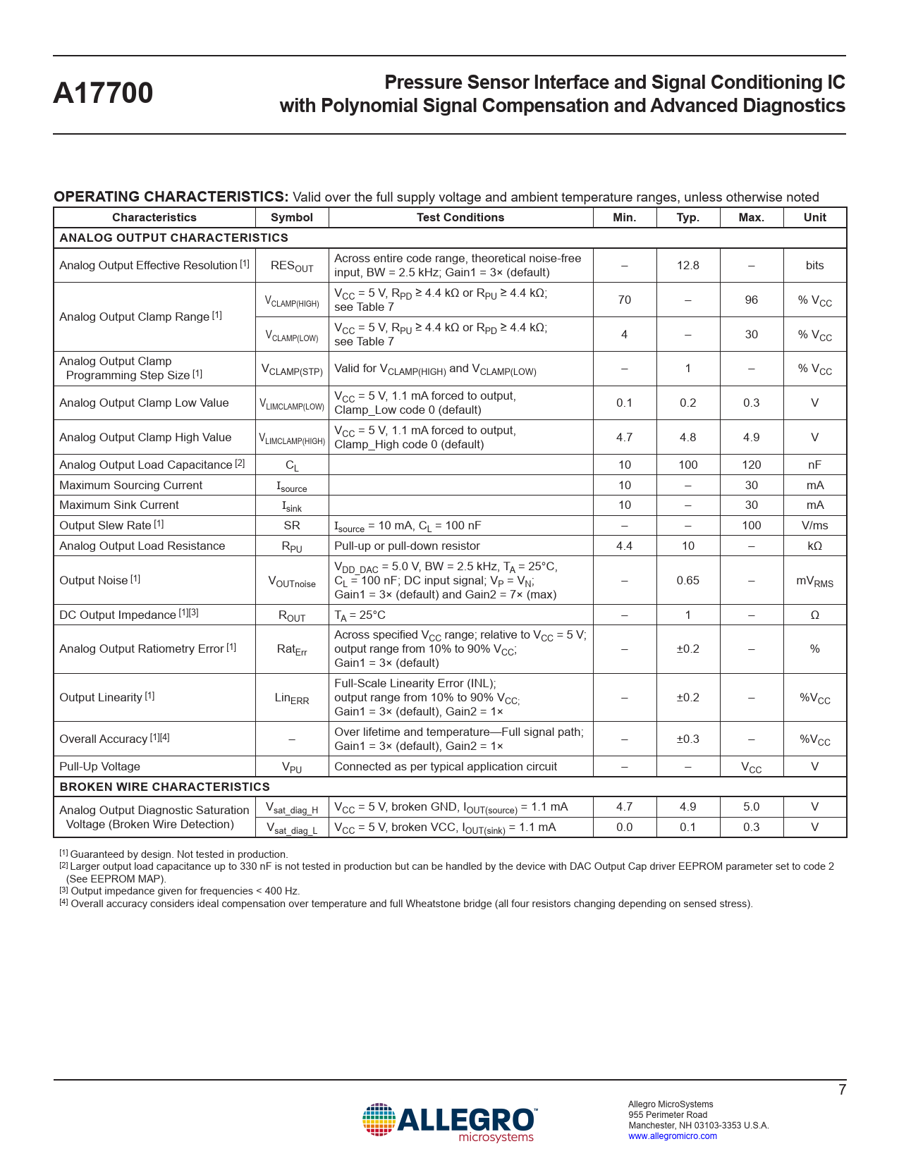 link to page 14 link to page 14 Pressure Sensor Interface and Signal Conditioning ICA17700with Polynomial Signal Compensation and Advanced DiagnosticsOPERATING CHARACTERISTICS: Valid over the full supply voltage and ambient temperature ranges, unless otherwise noted CharacteristicsSymbolTest ConditionsMin.Typ.Max.UnitANALOG OUTPUT CHARACTERISTICS Analog Output Effective Resolution [1] RES Across entire code range, theoretical noise-free OUT input, BW = 2.5 kHz; Gain1 = 3× (default) – 12.8 – bits V VCC = 5 V, RPD ≥ 4.4 kΩ or RPU ≥ 4.4 kΩ; CLAMP(HIGH) see Table 7 70 – 96 % VCC Analog Output Clamp Range [1] V VCC = 5 V, RPU ≥ 4.4 kΩ or RPD ≥ 4.4 kΩ; CLAMP(LOW) see Table 7 4 – 30 % VCC Analog Output Clamp Programming Step Size [1] VCLAMP(STP) Valid for VCLAMP(HIGH) and VCLAMP(LOW) – 1 – % VCC Analog Output Clamp Low Value V VCC = 5 V, 1.1 mA forced to output, LIMCLAMP(LOW) Clamp_Low code 0 (default) 0.1 0.2 0.3 V Analog Output Clamp High Value V VCC = 5 V, 1.1 mA forced to output, LIMCLAMP(HIGH) Clamp_High code 0 (default) 4.7 4.8 4.9 V Analog Output Load Capacitance [2] CL 10 100 120 nF Maximum Sourcing Current Isource 10 – 30 mA Maximum Sink Current Isink 10 – 30 mA Output Slew Rate [1] SR Isource = 10 mA, CL = 100 nF – – 100 V/ms Analog Output Load Resistance RPU Pull-up or pull-down resistor 4.4 10 – kΩ VDD_DAC = 5.0 V, BW = 2.5 kHz, TA = 25°C, Output Noise [1] VOUTnoise CL = 100 nF; DC input signal; VP = VN; – 0.65 – mVRMS Gain1 = 3× (default) and Gain2 = 7× (max) DC Output Impedance [1][3] ROUT TA = 25°C – 1 – Ω Across specified VCC range; relative to VCC = 5 V; Analog Output Ratiometry Error [1] RatErr output range from 10% to 90% VCC; – ±0.2 – % Gain1 = 3× (default) Full-Scale Linearity Error (INL); Output Linearity [1] LinERR output range from 10% to 90% VCC; – ±0.2 – %VCC Gain1 = 3× (default), Gain2 = 1× Overall Accuracy [1][4] – Over lifetime and temperature—Full signal path; Gain1 = 3× (default), Gain2 = 1× – ±0.3 – %VCC Pull-Up Voltage VPU Connected as per typical application circuit – – VCC V BROKEN WIRE CHARACTERISTICS Analog Output Diagnostic Saturation Vsat_diag_H VCC = 5 V, broken GND, IOUT(source) = 1.1 mA 4.7 4.9 5.0 V Voltage (Broken Wire Detection) Vsat_diag_L VCC = 5 V, broken VCC, IOUT(sink) = 1.1 mA 0.0 0.1 0.3 V [1] Guaranteed by design. Not tested in production. [2] Larger output load capacitance up to 330 nF is not tested in production but can be handled by the device with DAC Output Cap driver EEPROM parameter set to code 2 (See EEPROM MAP). [3] Output impedance given for frequencies < 400 Hz. [4] Overall accuracy considers ideal compensation over temperature and full Wheatstone bridge (all four resistors changing depending on sensed stress). 7 Allegro MicroSystems 955 Perimeter Road Manchester, NH 03103-3353 U.S.A. www.allegromicro.com Document Outline Features and Benefits Description Package Functional Block Diagram Selection Guide Absolute Maximum Ratings Thermal Characteristics Pinout Diagram and Terminal List Operating Characteristics Functional Description Bandwidth Selection Output Response Time Power-On Time Front End Gain Adjustment Front End Differential Offset Adjustment Input Signal Range Calculation Fine Adjustment and Temperature Compensation Output Protocols Digital Output Mode Selection Digital Output Driver Fall Time Selection Broken Wire Detection Diagnostic Features Programming: Manchester Communication Entering Manchester Coding Manchester Interface Message Structure CRC Device Access Shadow Registers Device EEPROM and Register Access Lock EEPROM Map Volatile Registers Map Power Derating Package Outline Drawing