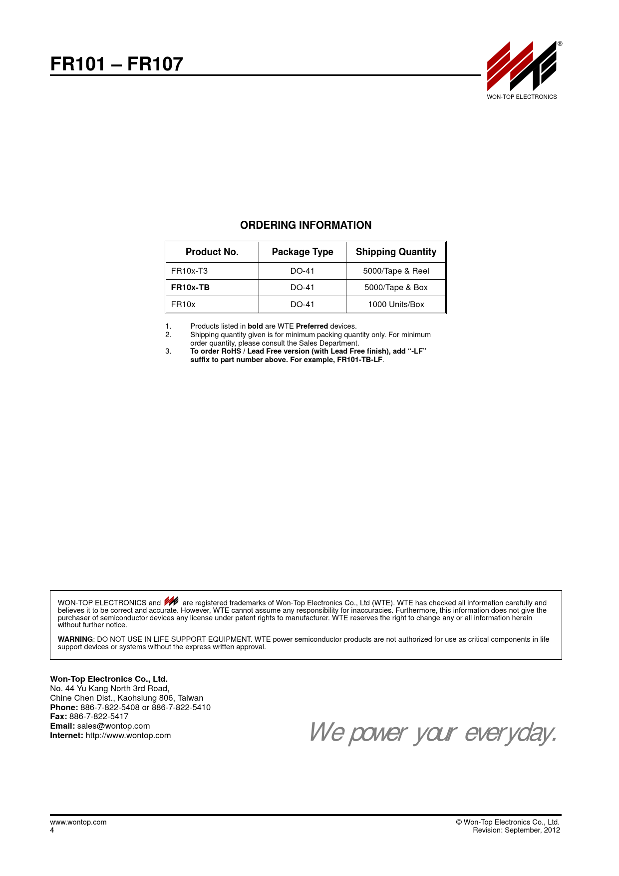 | Seiten / Seite | 4 / 4 — ® FR101 – FR107. WON-TOP ELECTRONICS ORDERING INFORMATION |