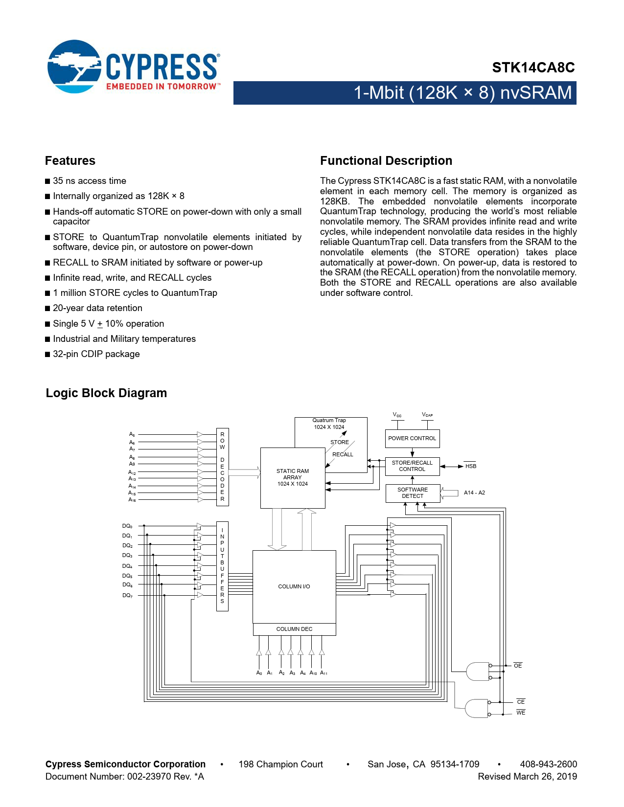 STK14CA8C 1-Mbit (128K × 8) nvSRAM 1-Mbit (128K × 8) nvSRAMFeaturesFunctional Description ■ 35 ns access time The Cypress STK14CA8C is a fast static RAM, with a nonvolatile element in each memory cell. The memory is organized as ■ Internally organized as 128K × 8 128KB. The embedded nonvolatile elements incorporate ■ Hands-off automatic STORE on power-down with only a smal QuantumTrap technology, producing the world’s most reliable capacitor nonvolatile memory. The SRAM provides infinite read and write cycles, while independent nonvolatile data resides in the highly ■ STORE to QuantumTrap nonvolatile elements initiated by reliable QuantumTrap cell. Data transfers from the SRAM to the software, device pin, or autostore on power-down nonvolatile elements (the STORE operation) takes place ■ RECALL to SRAM initiated by software or power-up automatically at power-down. On power-up, data is restored to the SRAM (the RECALL operation) from the nonvolatile memory. ■ Infinite read, write, and RECALL cycles Both the STORE and RECALL operations are also available ■ 1 million STORE cycles to QuantumTrap under software control. ■ 20-year data retention ■ Single 5 V + 10% operation ■ Industrial and Military temperatures ■ 32-pin CDIP package Logic Block Diagram VCC VCAP Quatrum Trap 1024 X 1024 A5 R O POWER CONTROL A6 STORE W A7 RECALL A8 D A9 STORE/RECALL E HSB A STATIC RAM CONTROL 12 C A ARRAY 13 O 1024 X 1024 A14 D A15 E SOFTWARE A14 - A2 A R DETECT 16 DQ0 I DQ1 N P DQ2 U DQ3 T B DQ4 U DQ5 F F DQ6 COLUMN I/O E DQ7 R S COLUMN DEC OE A0 A1 A2 A3 A4 A10 A11 CE WE Cypress Semiconductor Corporation • 198 Champion Court • San Jose, CA 95134-1709 • 408-943-2600 Document Number: 002-23970 Rev. *A Revised March 26, 2019 Document Outline 1-Mbit (128K × 8) nvSRAM Features Functional Description Logic Block Diagram Contents Pinout Pin Definitions Device Operation SRAM Read SRAM Write AutoStore Operation Hardware STORE Operation Hardware RECALL (Power-up) Software STORE Software RECALL Preventing AutoStore Data Protection Maximum Ratings Operating Range DC Electrical Characteristics Data Retention and Endurance Capacitance Thermal Resistance AC Test Loads AC Test Conditions AC Switching Characteristics SRAM Read Cycle SRAM Write Cycle Switching Waveforms AutoStore/Power-up RECALL Switching Waveforms Software Controlled STORE/RECALL Cycle Switching Waveforms Hardware STORE Cycle Switching Waveforms Truth Table For SRAM Operations Ordering Information Ordering Code Definitions for Industrial Temperature Ordering Code Definitions for Military Temperature Package Diagram Acronyms Document Conventions Units of Measure Document History Page Sales, Solutions, and Legal Information Worldwide Sales and Design Support Products PSoC® Solutions Cypress Developer Community Technical Support