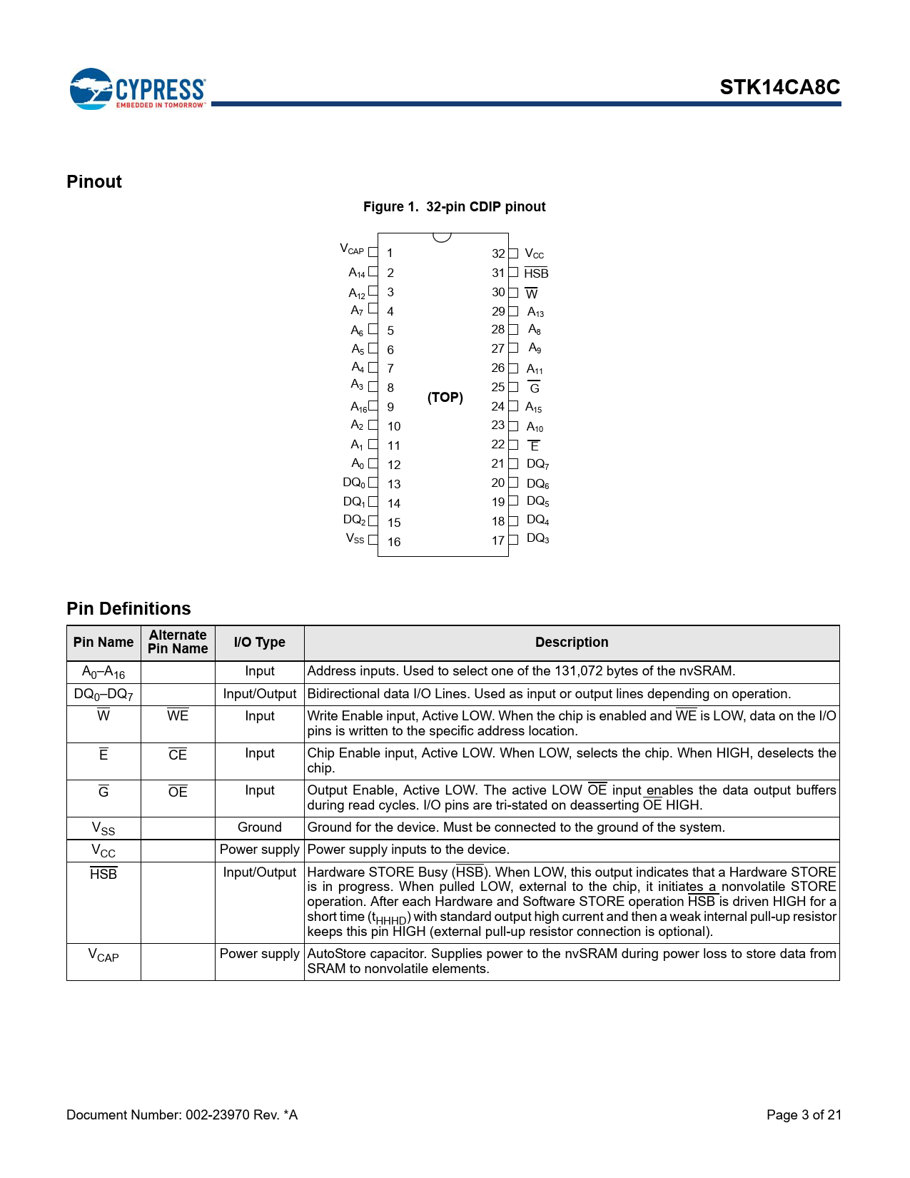 STK14CA8C. Pinout. Figure 1. 32-pin CDIP pinout. (TOP). Pin Definitions. Pin Name. Alternate. I/O Type. Description