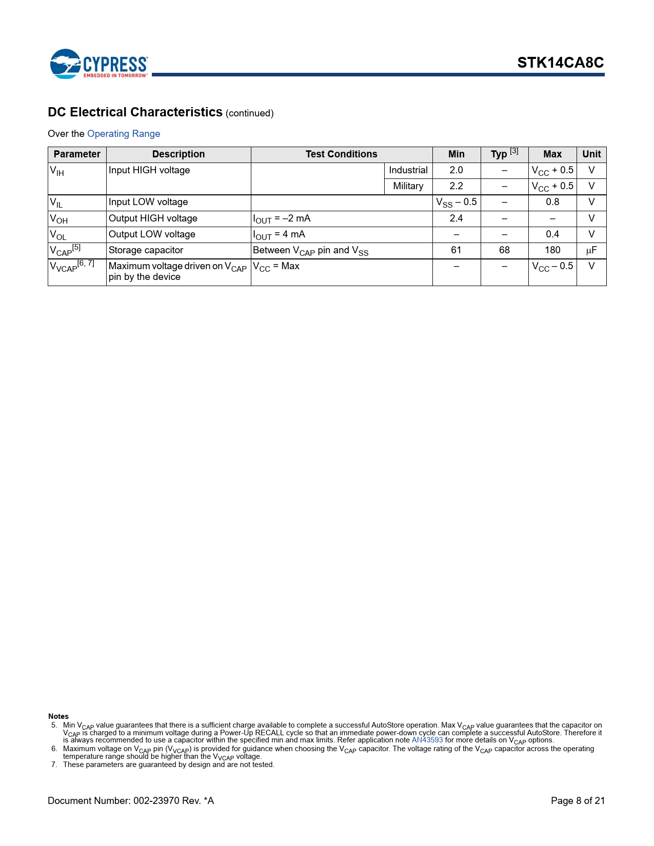 VIH Input HIGH voltage Industrial 2.0 – VCC + 0.5 V Military 2.2 – VCC + 0.5 V VIL Input LOW voltage VSS – 0.5 – 0.8 V VOH Output HIGH voltage IOUT = –2 mA 2.4 – – V VOL Output LOW voltage IOUT = 4 mA – – 0.4 V V [5] CAP Storage capacitor Between VCAP pin and VSS 61 68 180 F V [6, 7] VCAP Maximum voltage driven on VCAP VCC = Max – – VCC – 0.5 V pin by the device