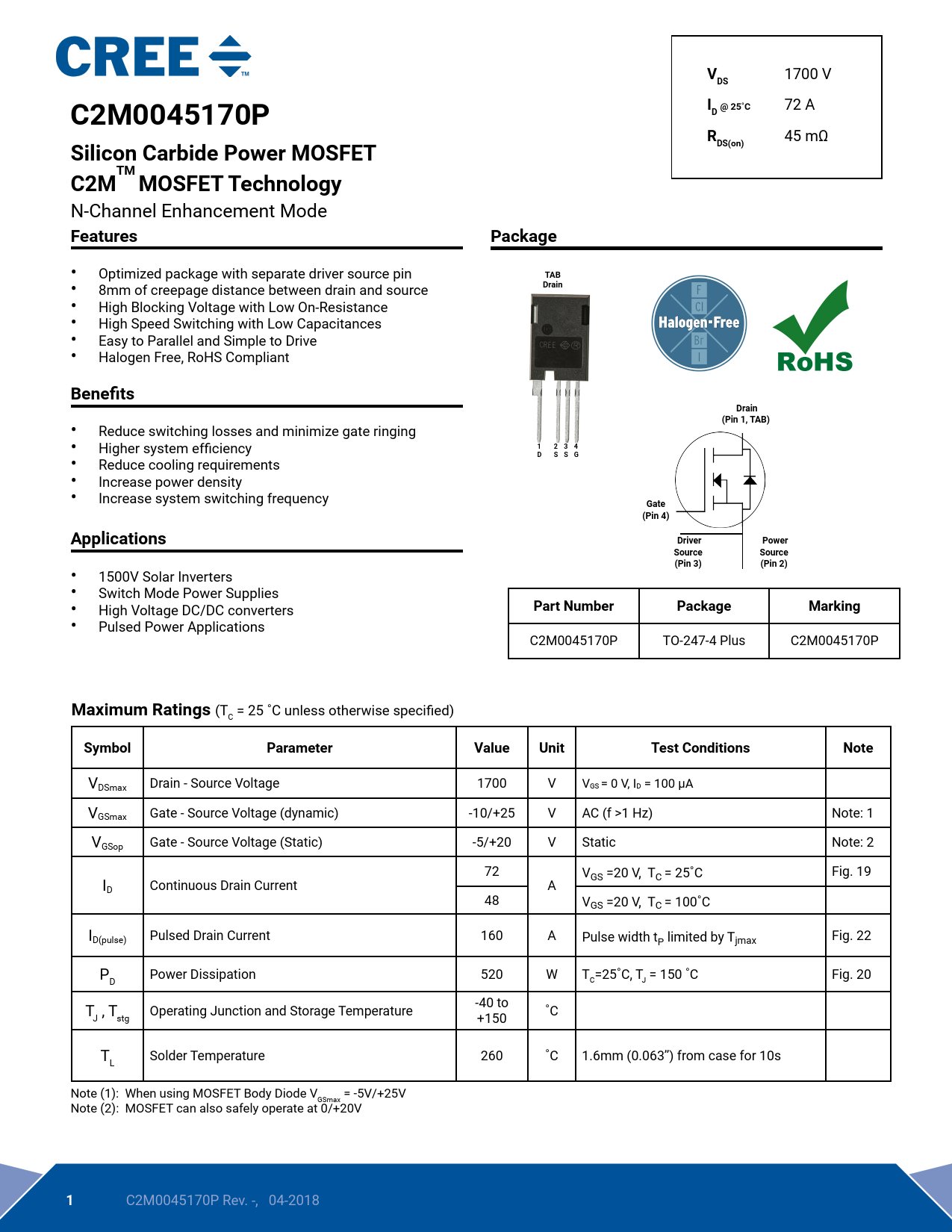 C2M0045170P. I D@ 25˚C. Silicon Carbide Power MOSFET. DS(on). C2MTM MOSFET Technology. Features. Package. TAB. Drain. Benefits