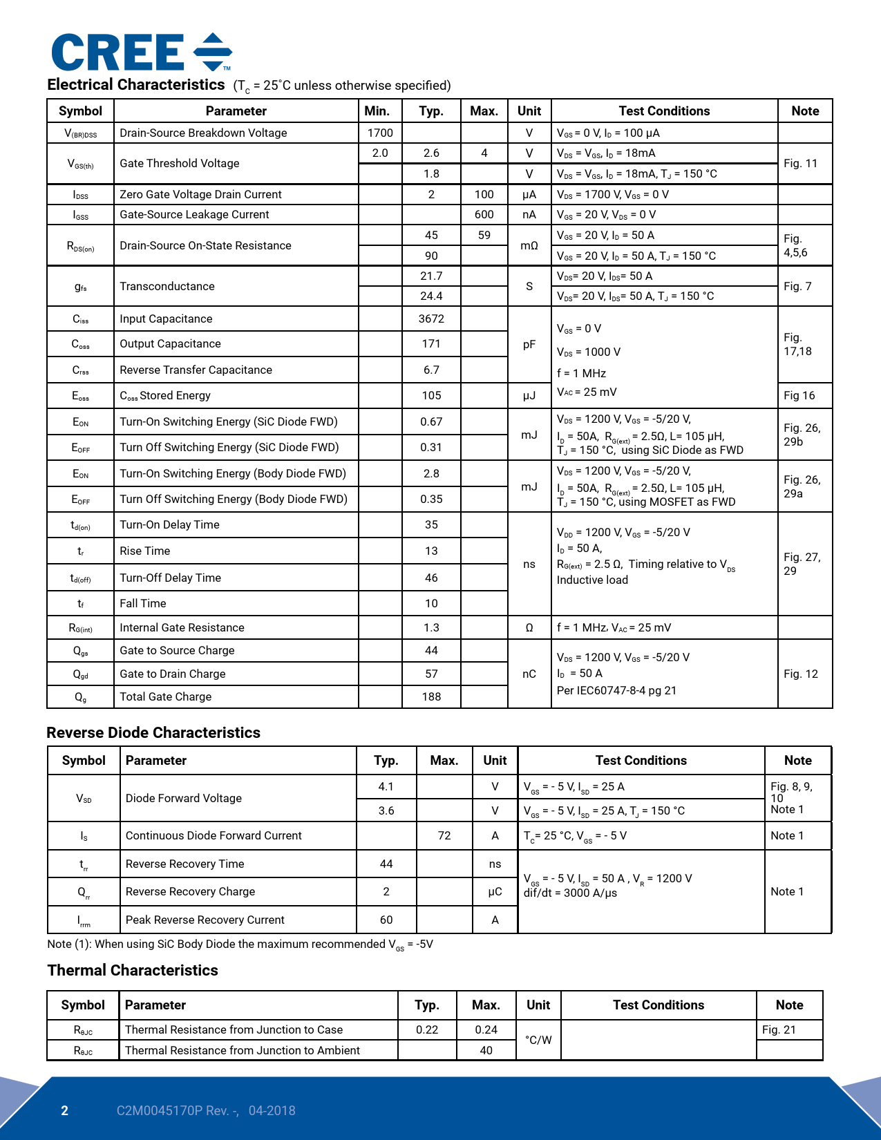 Electrical Characteristics (T = 25˚C unless otherwise specified) C SymbolParameterMin.Typ.Max.UnitTest ConditionsNote V(BR)DSS Drain-Source Breakdown Voltage 1700 V VGS = 0 V, ID = 100 μA 2.0 2.6 4 V V V DS = VGS, ID = 18mA GS(th) Gate Threshold Voltage Fig. 11 1.8 V VDS = VGS, ID = 18mA, TJ = 150 °C IDSS Zero Gate Voltage Drain Current 2 100 μA VDS = 1700 V, VGS = 0 V IGSS Gate-Source Leakage Current 600 nA VGS = 20 V, VDS = 0 V 45 59 V R GS = 20 V, ID = 50 A Fig. DS(on) Drain-Source On-State Resistance mΩ 4,5,6 90 VGS = 20 V, ID = 50 A, TJ = 150 °C 21.7 V g DS= 20 V, IDS= 50 A fs Transconductance S Fig. 7 24.4 VDS= 20 V, IDS= 50 A, TJ = 150 °C Ciss Input Capacitance 3672 VGS = 0 V Coss Output Capacitance 171 pF Fig. VDS = 1000 V 17,18 Crss Reverse Transfer Capacitance 6.7 f = 1 MHz VAC = 25 mV Eoss Coss Stored Energy 105 μJ Fig 16 E V ON Turn-On Switching Energy (SiC Diode FWD) 0.67 DS = 1200 V, VGS = -5/20 V, mJ Fig. 26, I = 50A, R = 2.5Ω, L= 105 μH, D G(ext) 29b EOFF Turn Off Switching Energy (SiC Diode FWD) 0.31 TJ = 150 °C, using SiC Diode as FWD E V ON Turn-On Switching Energy (Body Diode FWD) 2.8 DS = 1200 V, VGS = -5/20 V, mJ Fig. 26, I = 50A, R = 2.5Ω, L= 105 μH, D G(ext) 29a EOFF Turn Off Switching Energy (Body Diode FWD) 0.35 TJ = 150 °C, using MOSFET as FWD td(on) Turn-On Delay Time 35 VDD = 1200 V, VGS = -5/20 V t ID = 50 A, r Rise Time 13 ns R Fig. 27, G(ext) = 2.5 Ω, Timing relative to V DS 29 td(off) Turn-Off Delay Time 46 Inductive load tf Fall Time 10 RG(int) Internal Gate Resistance 1.3 Ω f = 1 MHz, VAC = 25 mV Qgs Gate to Source Charge 44 VDS = 1200 V, VGS = -5/20 V Qgd Gate to Drain Charge 57 nC ID = 50 A Fig. 12 Per IEC60747-8-4 pg 21 Qg Total Gate Charge 188 Reverse Diode CharacteristicsSymbolParameterTyp.Max.UnitTest ConditionsNote 4.1 V V = - 5 V, I = 25 A Fig. 8, 9, V GS SD SD Diode Forward Voltage 10 3.6 V V = - 5 V, I = 25 A, T = 150 °C Note 1 GS SD J IS Continuous Diode Forward Current 72 A T = 25 °C, V = - 5 V Note 1 C GS t Reverse Recovery Time 44 ns rr V = - 5 V, I = 50 A , V = 1200 V GS SD R Q Reverse Recovery Charge 2 µC rr dif/dt = 3000 A/µs Note 1 I Peak Reverse Recovery Current 60 A rrm Note (1): When using SiC Body Diode the maximum recommended V = -5V GS Thermal CharacteristicsSymbolParameterTyp.Max.UnitTest ConditionsNote RθJC Thermal Resistance from Junction to Case 0.22 0.24 Fig. 21 °C/W RθJC Thermal Resistance from Junction to Ambient 40 2 C2M0045170P Rev. -, 04-2018
