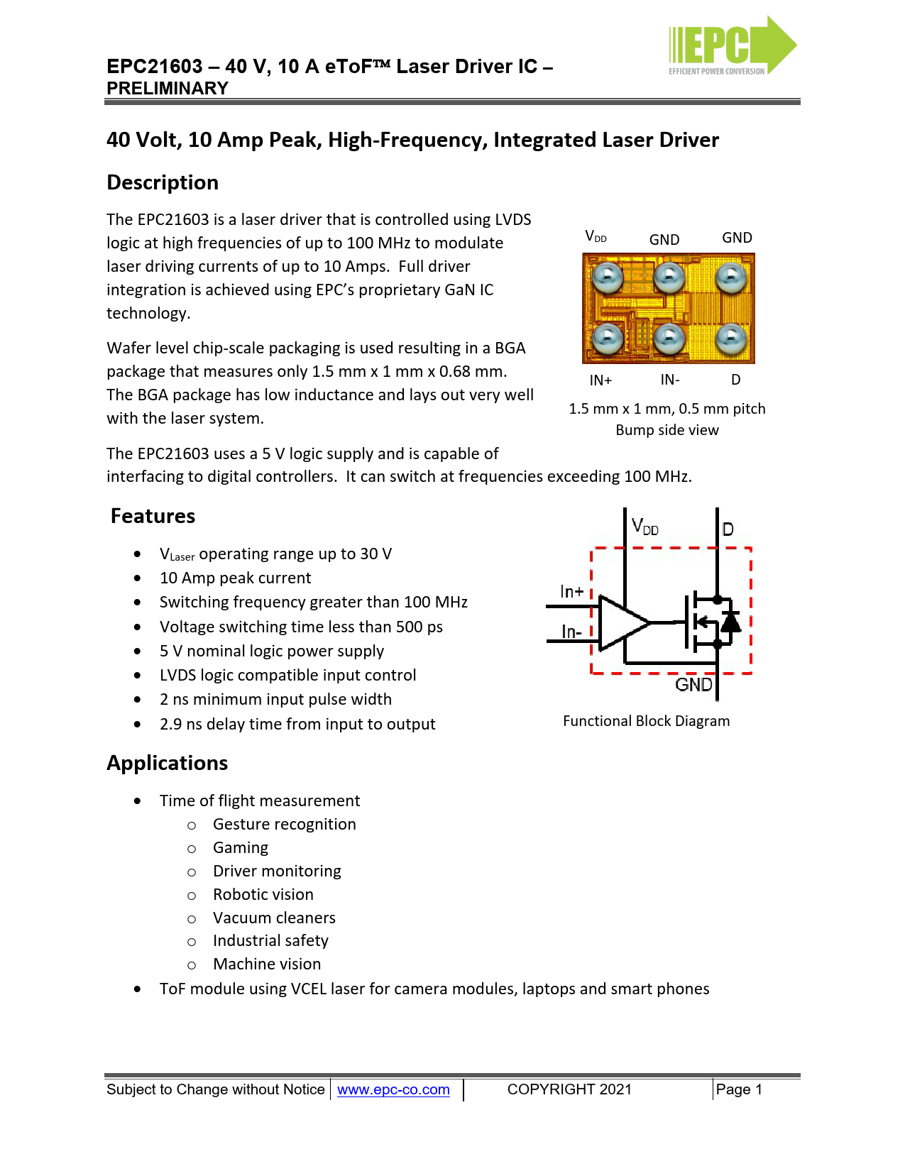 EPC21603 – 40 V, 10 A eToF. Laser Driver IC –. PRELIMINARY