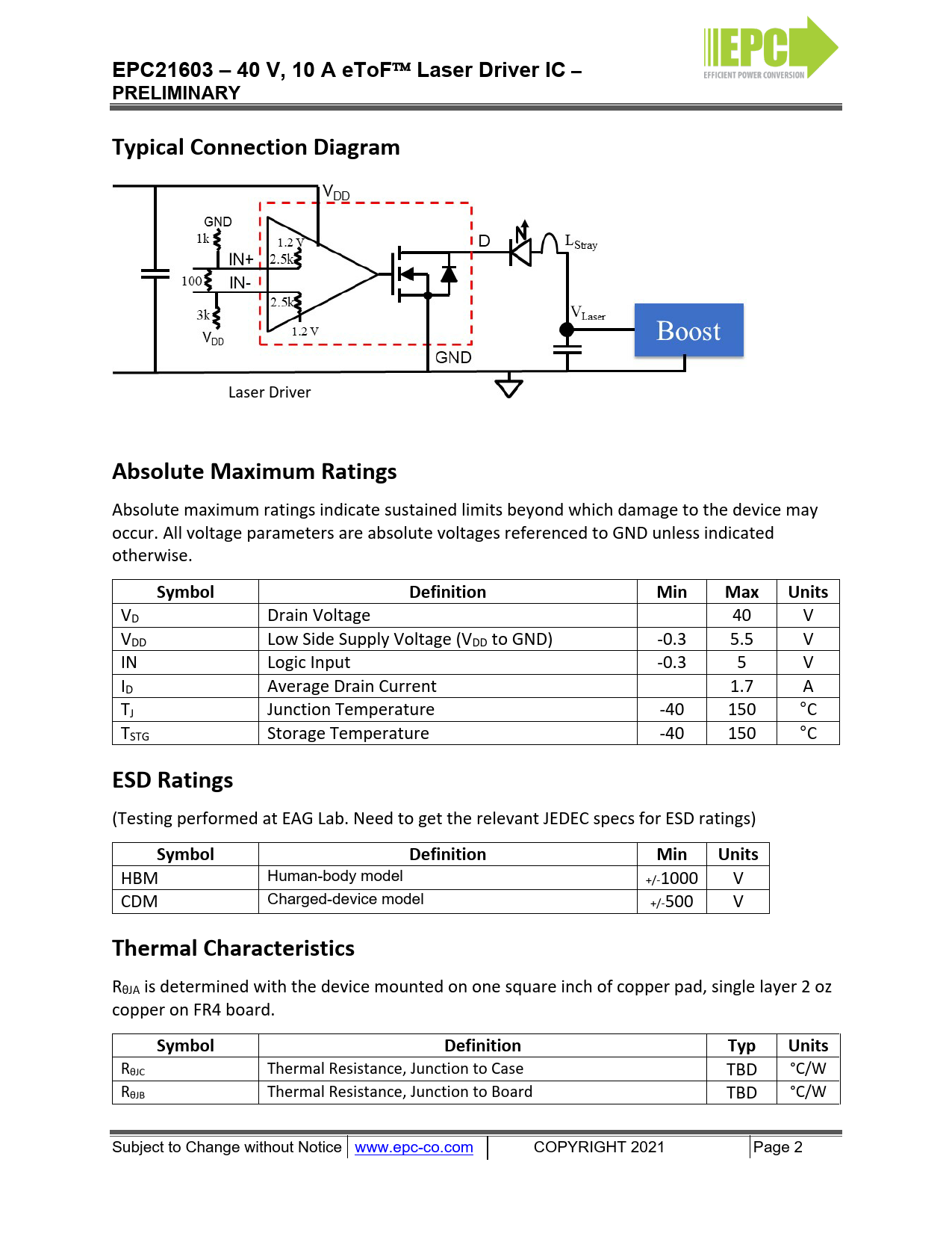 EPC21603 – 40 V, 10 A eToF. Laser Driver IC –. PRELIMINARY. Typical Connection Diagram. Absolute Maximum Ratings. Symbol