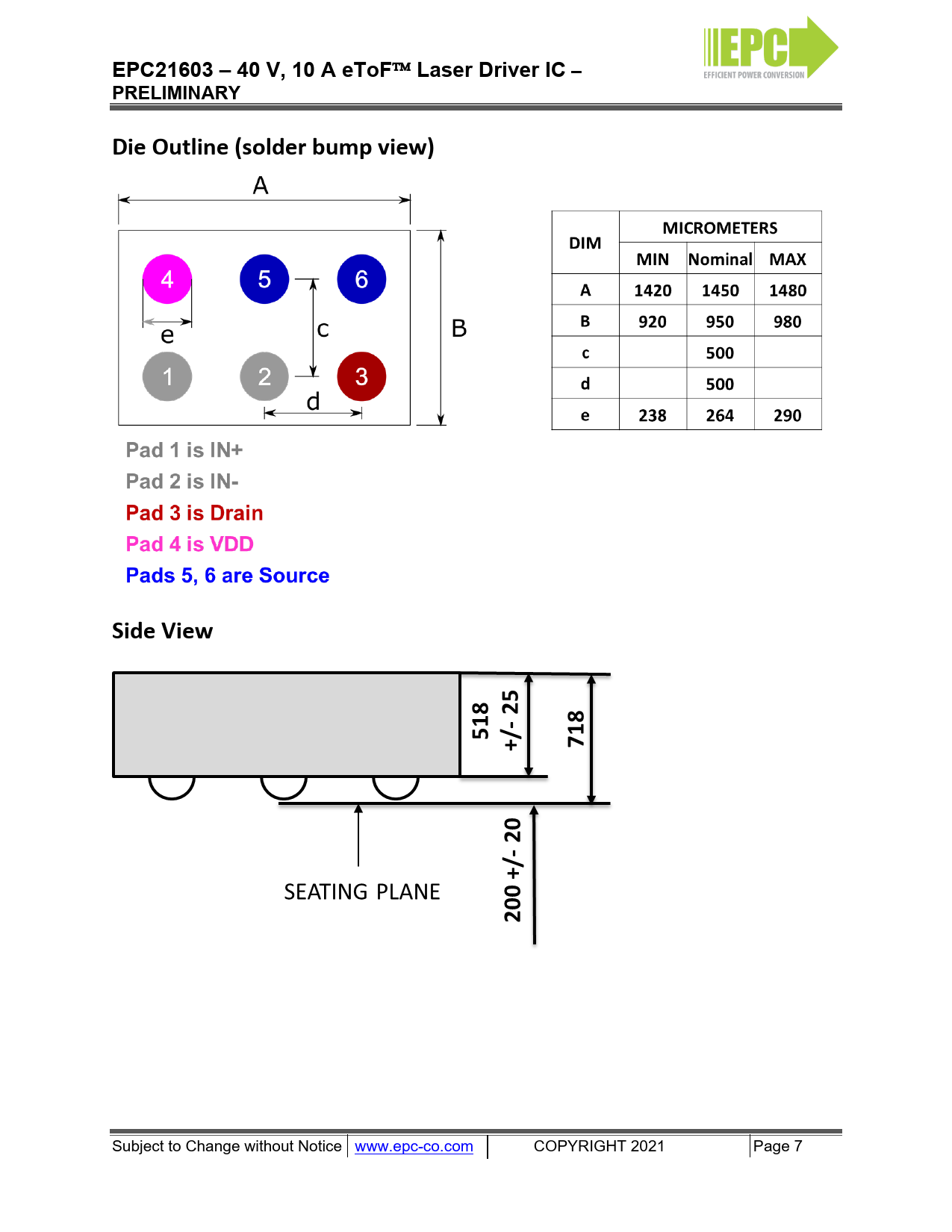 EPC21603 – 40 V, 10 A eToF. Laser Driver IC –. PRELIMINARY. Die Outline (solder bump view). Side View