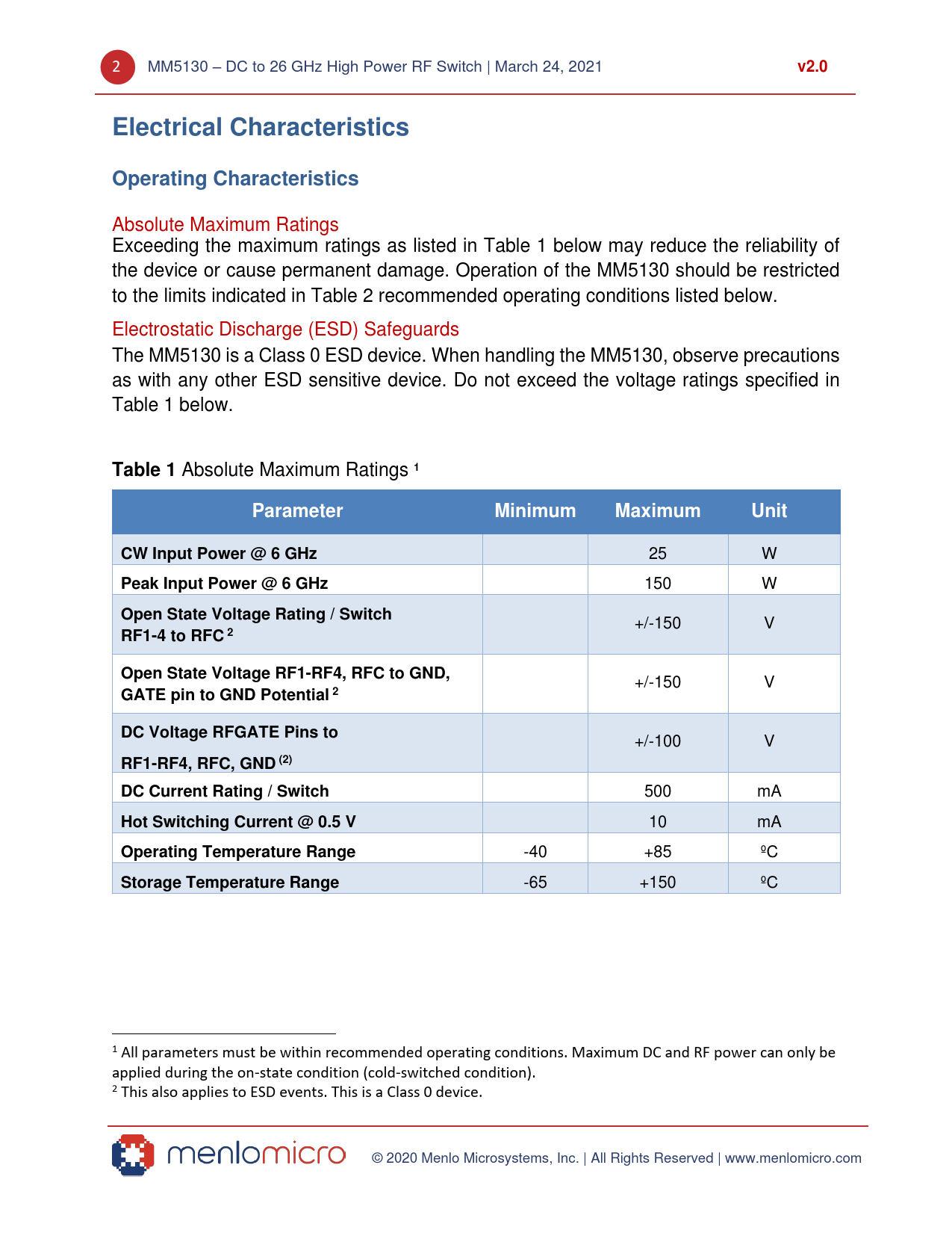 -65 +150 ºC 1 All parameters must be within recommended operating conditions. Maximum DC and RF power can only be applied during the on-state condition (cold-switched condition). 2 This also applies to ESD events. This is a Class 0 device. © 2020 Menlo Microsystems, Inc. | All Rights Reserved | www.menlomicro.com