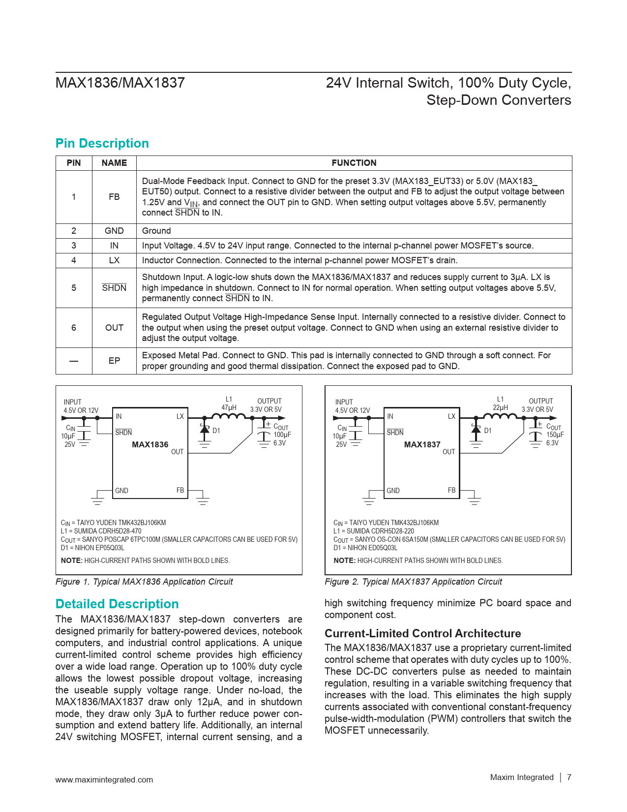 MAX1836/MAX1837 24V Internal Switch, 100% Duty Cycle, Step-Down Converters Pin DescriptionPINNAMEFUNCTION Dual-Mode Feedback Input. Connect to GND for the preset 3.3V (MAX183_EUT33) or 5.0V (MAX183_ 1 FB EUT50) output. Connect to a resistive divider between the output and FB to adjust the output voltage between 1.25V and VIN, and connect the OUT pin to GND. When setting output voltages above 5.5V, permanently connect SHDN to IN. 2 GND Ground 3 IN Input Voltage. 4.5V to 24V input range. Connected to the internal p-channel power MOSFET’s source. 4 LX Inductor Connection. Connected to the internal p-channel power MOSFET’s drain. Shutdown Input. A logic-low shuts down the MAX1836/MAX1837 and reduces supply current to 3µA. LX is 5 SHDN high impedance in shutdown. Connect to IN for normal operation. When setting output voltages above 5.5V, permanently connect SHDN to IN. Regulated Output Voltage High-Impedance Sense Input. Internally connected to a resistive divider. Connect to 6 OUT the output when using the preset output voltage. Connect to GND when using an external resistive divider to adjust the output voltage. — EP Exposed Metal Pad. Connect to GND. This pad is internally connected to GND through a soft connect. For proper grounding and good thermal dissipation. Connect the exposed pad to GND. INPUT L1 OUTPUT INPUT L1 OUTPUT 4.5V OR 12V 47µH 3.3V OR 5V 4.5V OR 12V 22µH 3.3V OR 5V IN LX IN LX CIN D1 COUT CIN D1 COUT 10µF SHDN 100µF SHDN 10µF 150µF 25V MAX1836 6.3V 25V MAX1837 6.3V OUT OUT GND FB GND FB CIN = TAIYO YUDEN TMK432BJ106KM CIN = TAIYO YUDEN TMK432BJ106KM L1 = SUMIDA CDRH5D28-470 L1 = SUMIDA CDRH5D28-220 COUT = SANYO POSCAP 6TPC100M (SMALLER CAPACITORS CAN BE USED FOR 5V) COUT = SANYO OS-CON 6SA150M (SMALLER CAPACITORS CAN BE USED FOR 5V) D1 = NIHON EP05Q03L D1 = NIHON ED05Q03L NOTE: HIGH-CURRENT PATHS SHOWN WITH BOLD LINES. NOTE: HIGH-CURRENT PATHS SHOWN WITH BOLD LINES. Figure 1. Typical MAX1836 Application Circuit Figure 2. Typical MAX1837 Application Circuit Detailed Description high switching frequency minimize PC board space and The MAX1836/MAX1837 step-down converters are component cost. designed primarily for battery-powered devices, notebook Current-Limited Control Architecture computers, and industrial control applications. A unique The MAX1836/MAX1837 use a proprietary current-limited current-limited control scheme provides high efficiency control scheme that operates with duty cycles up to 100%. over a wide load range. Operation up to 100% duty cycle These DC-DC converters pulse as needed to maintain allows the lowest possible dropout voltage, increasing regulation, resulting in a variable switching frequency that the useable supply voltage range. Under no-load, the increases with the load. This eliminates the high supply MAX1836/MAX1837 draw only 12μA, and in shutdown currents associated with conventional constant-frequency mode, they draw only 3μA to further reduce power con- pulse-width-modulation (PWM) controllers that switch the sumption and extend battery life. Additionally, an internal MOSFET unnecessarily. 24V switching MOSFET, internal current sensing, and a www.maximintegrated.com Maxim Integrated │ 7