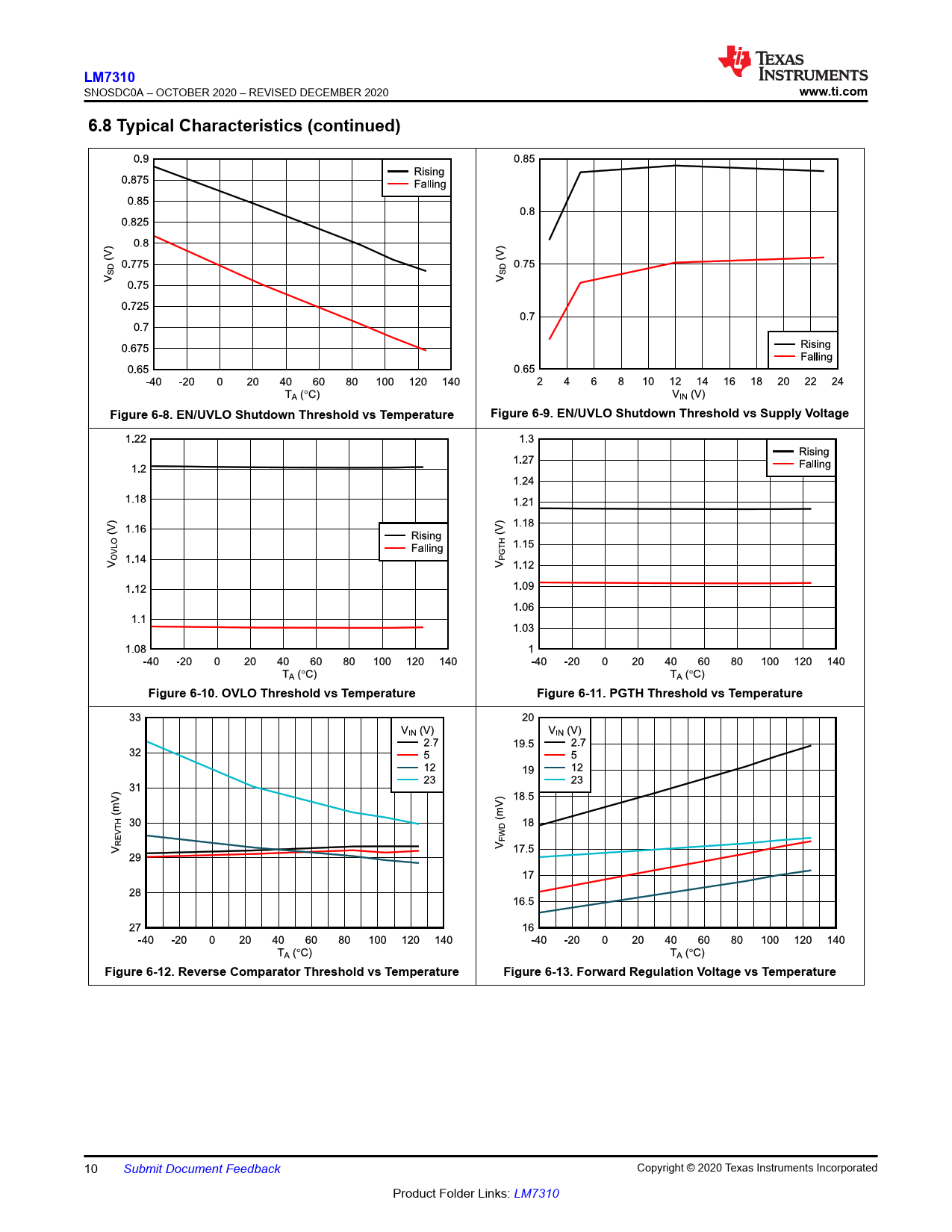 www.ti.com 6.8 Typical Characteristics (continued) Figure 6-8. EN/UVLO Shutdown Threshold vs Temperature Figure 6-9. EN/UVLO Shutdown Threshold vs Supply Voltage Figure 6-10. OVLO Threshold vs Temperature Figure 6-11. PGTH Threshold vs Temperature Figure 6-12. Reverse Comparator Threshold vs Temperature Figure 6-13. Forward Regulation Voltage vs Temperature